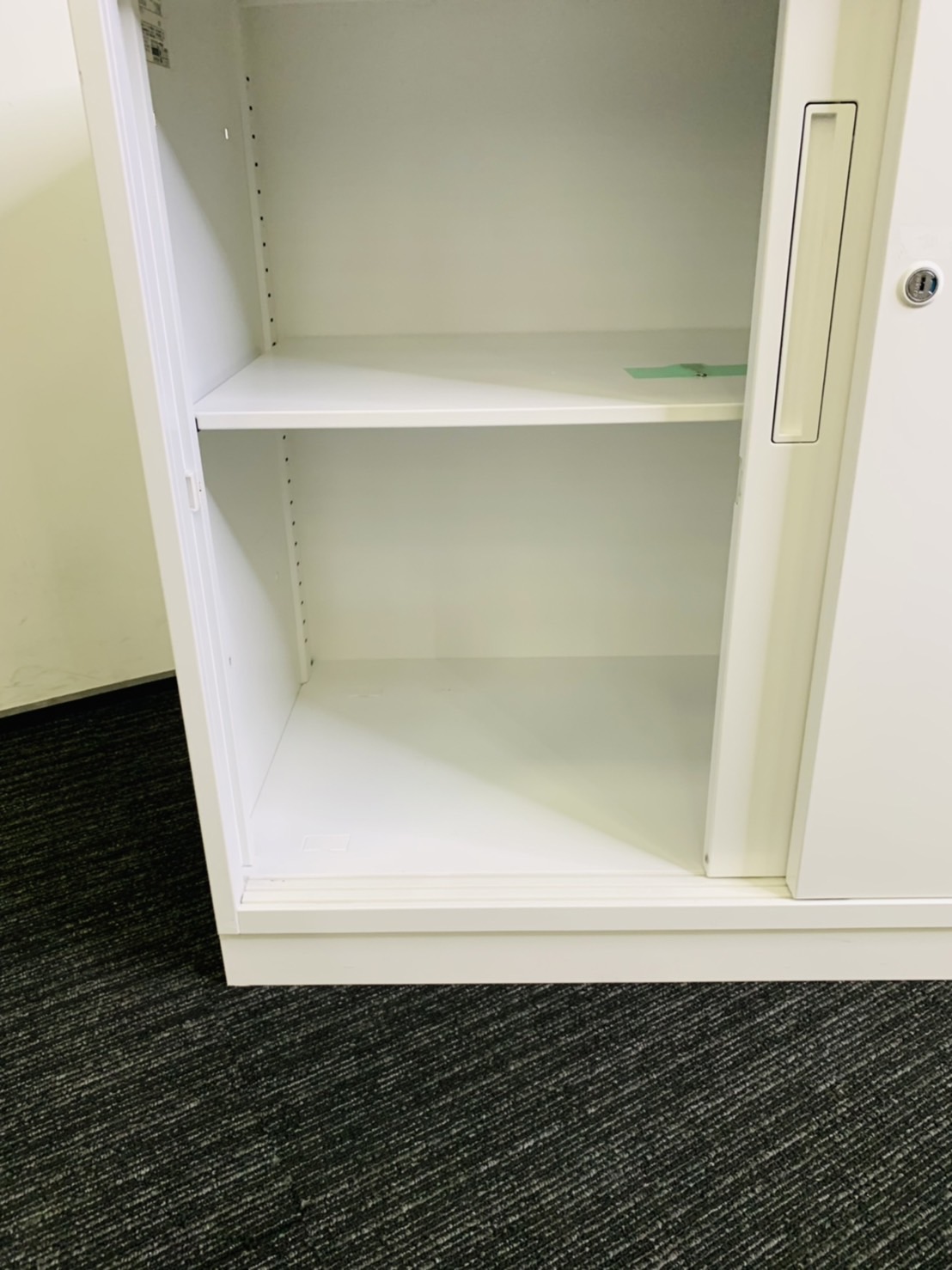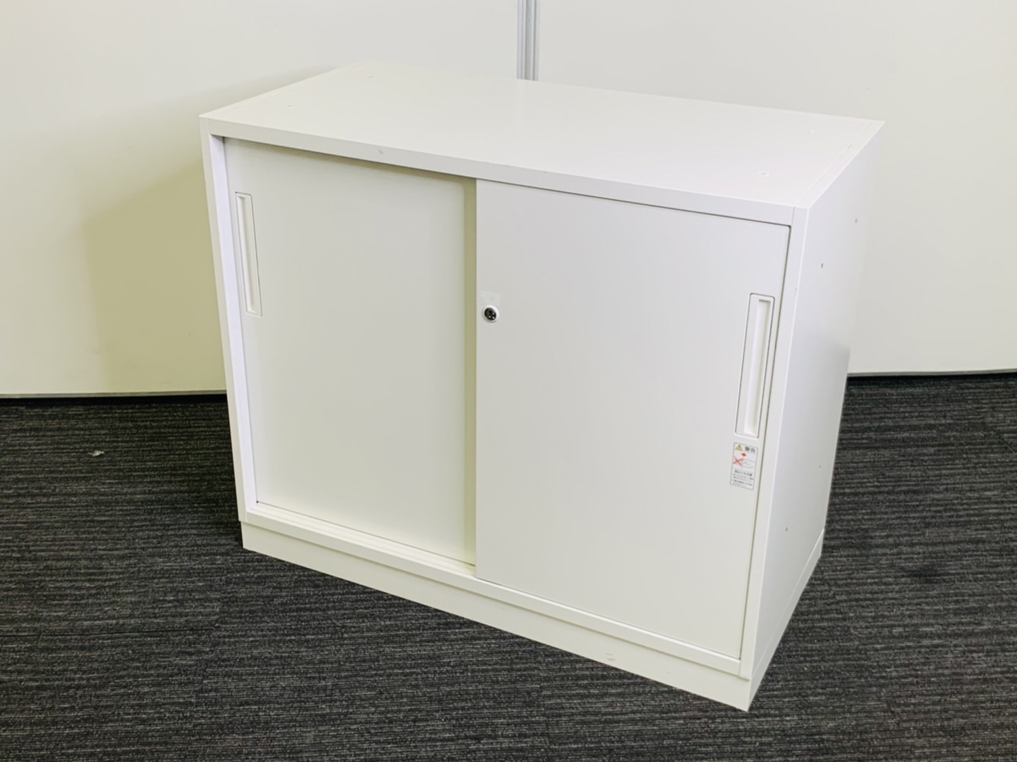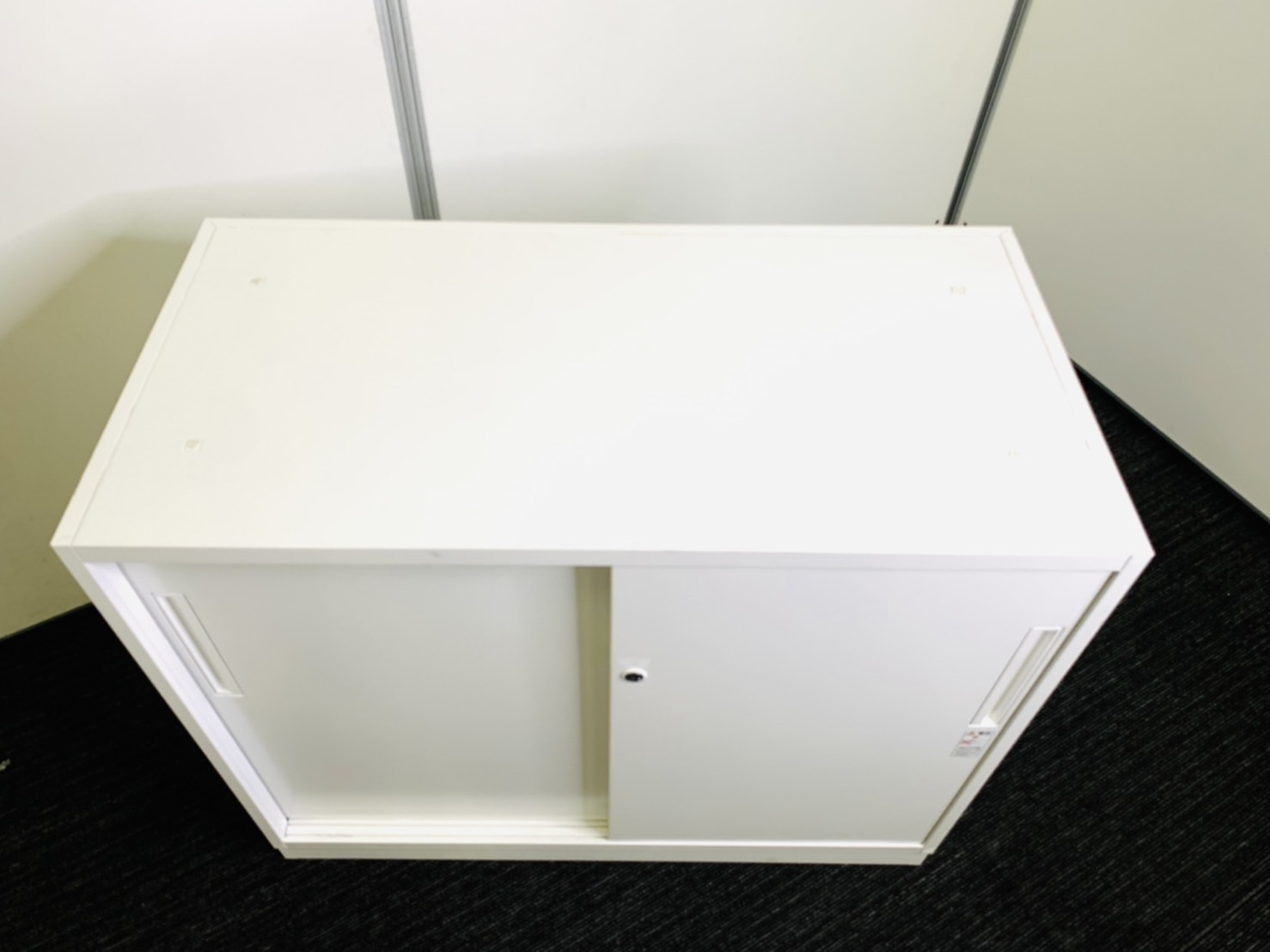 【スライド引き戸だから開閉スペースに困らない!】■コクヨ(KOKUYO)製 エディア(EDIA)シリーズ 2枚引き違い書庫 ローキャビネット シリンダー錠 天板付き ベース付き ホワイト シリンダー錠 収納 中古家具 格安 福岡 オフィス家具 九州最大級《オフィスバスターズ福岡博多店は、福岡を拠点として、日本全国へ中古オフィス用品・オフィス家具を提供しております》