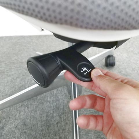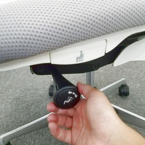 - 座面右下のダイヤル操作で、リクライニングの強弱調整が行えます。これまでのダイヤル式よりも、少ない回転数で、最弱?最強の調整が可能です。