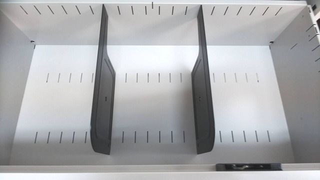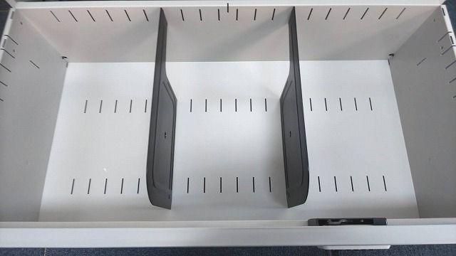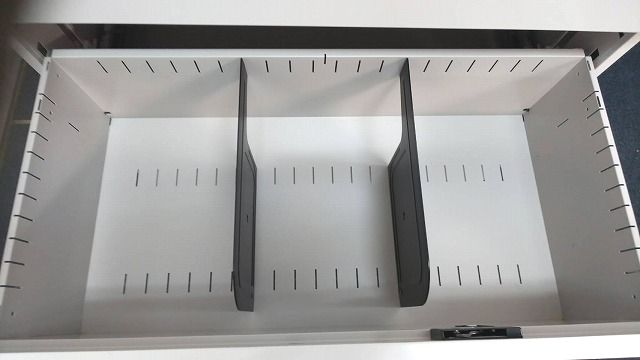 3段ラテラル書庫のダイヤルの色がブラックで引き出しのデザインが上2段と違う為、訳あり商品となっておりますが使用上の問題は御座いません。