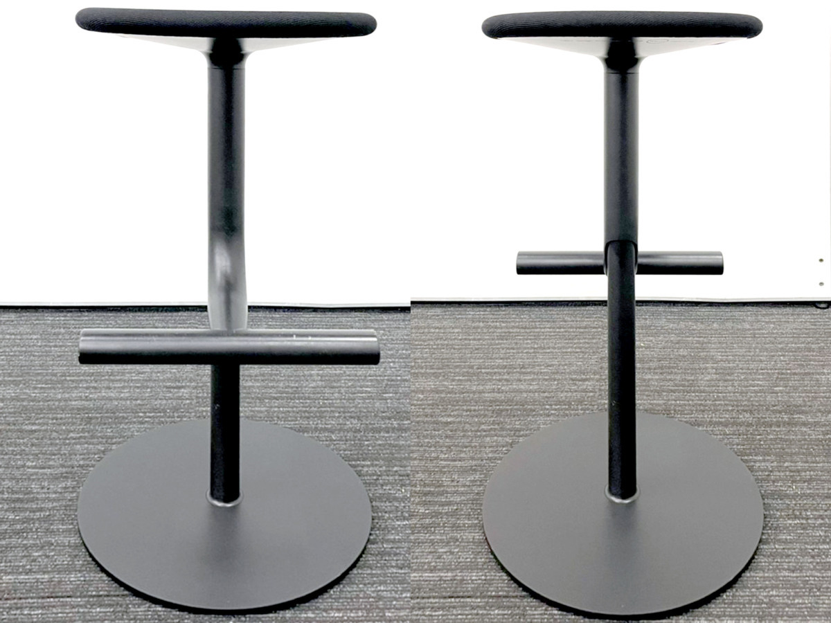 座面から足置きまで一つの曲線でつながっている形が特徴のこのスツールは、どのパーツも同じ色に仕上げられており、各パーツが同等に重要だということを示している。 フレームのスティールはキズが付きにくい仕上げになっており、座面は適度に柔らかく、座面は同色ファブリックの布巻き。