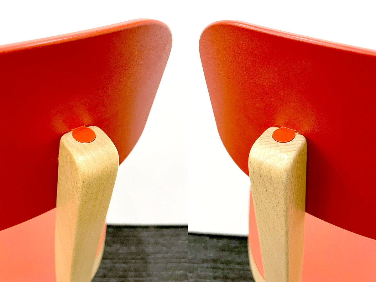 フレームに木材、背と座にプラスチックを利用した異素材の組み合わせ手が特徴的。プラスチックのパーツとフレームのジョイントにネジを使わない技術も光ります。