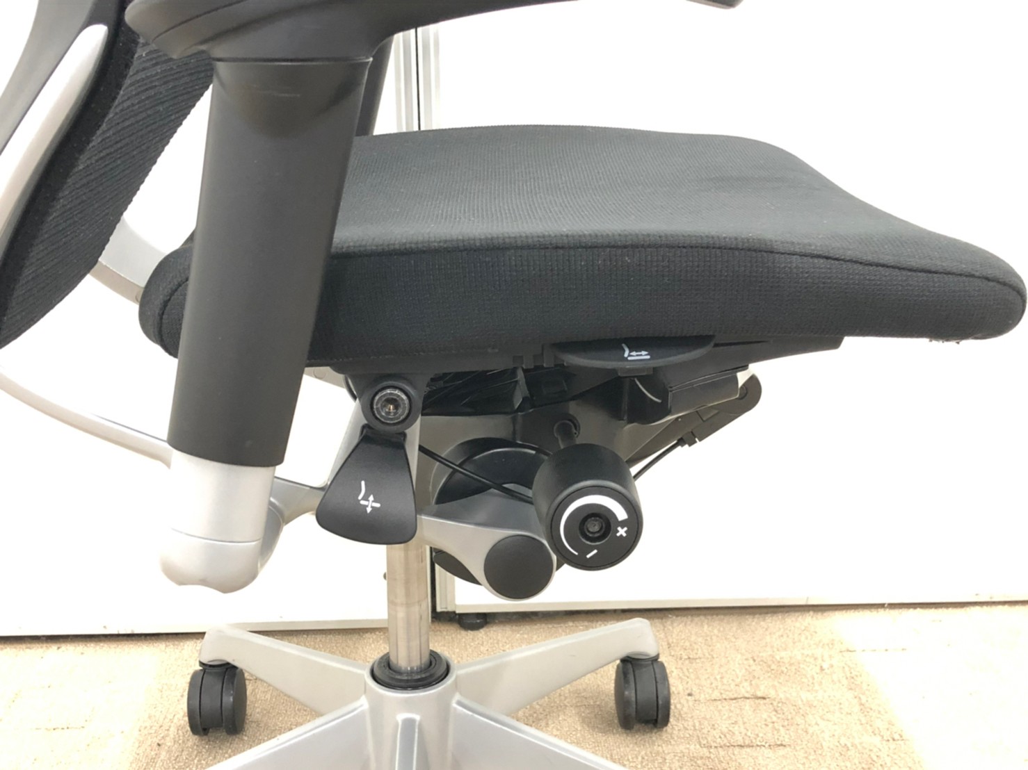上下昇降はもちろんのこと、リクライニング(ロック、強弱)、座面前後調整、
