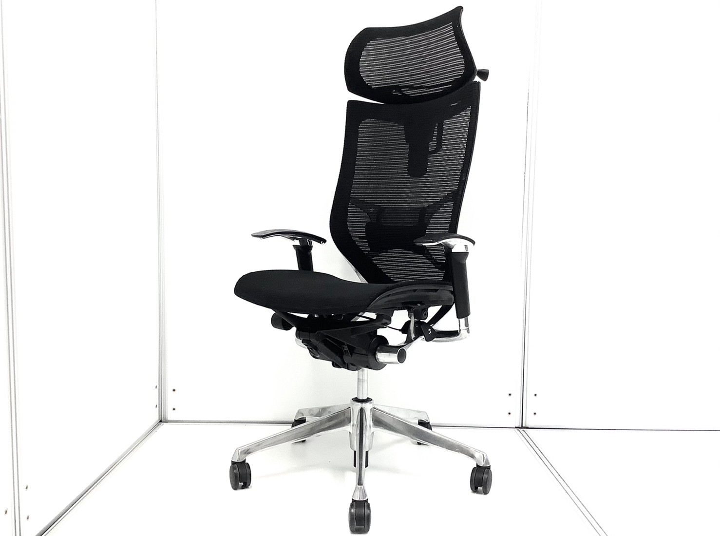 【2018年製】オカムラ バロンチェア エクストラハイバックモデル 座:メッシュ 背:メッシュ シルバーフレーム アジャストアーム 可動ヘッドレスト搭載 ※座面ヨレあり
