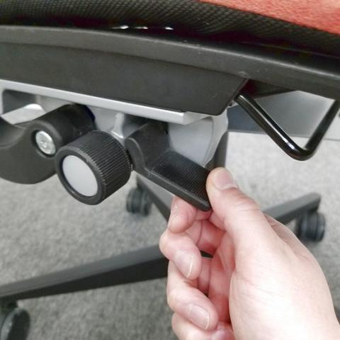 - レバーを引き上げながら座面を前後にスライドさせ、レバーを放すとロックします。背もたれに身体をつけた状態で膝の裏側と座面のエッジの間に5-8センチほどの隙間ができるのが理想的です。