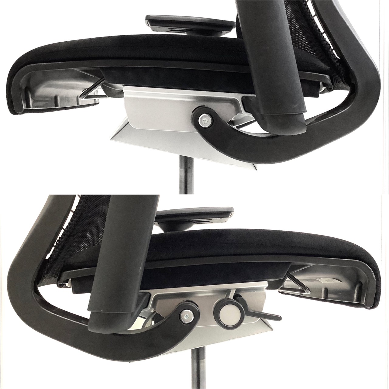- レバーを引き上げながら座面を前後にスライドさせ、レバーを放すとロックします。背もたれに身体をつけた状態で膝の裏側と座面のエッジの間に5-8センチほどの隙間ができるのが理想的です。