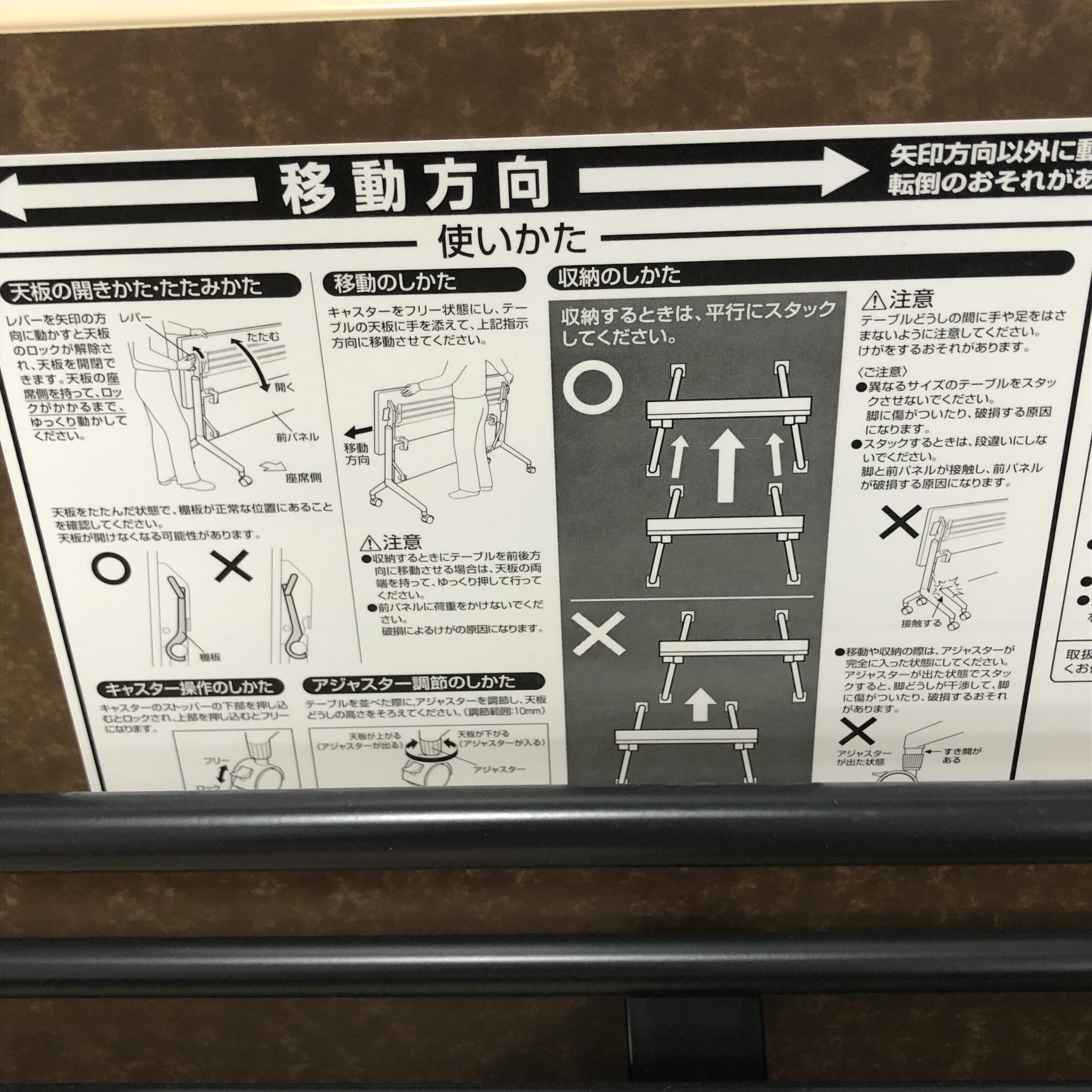 - 一部不具合あり天板歪み、アジャスター無し、キャスター使用不可ようなそのテーブルの本来の効用を果たすための機能以外の一部が使用不可な状態。(例、キャスターロッ ク機能使用不可、棚板無し等がある。)