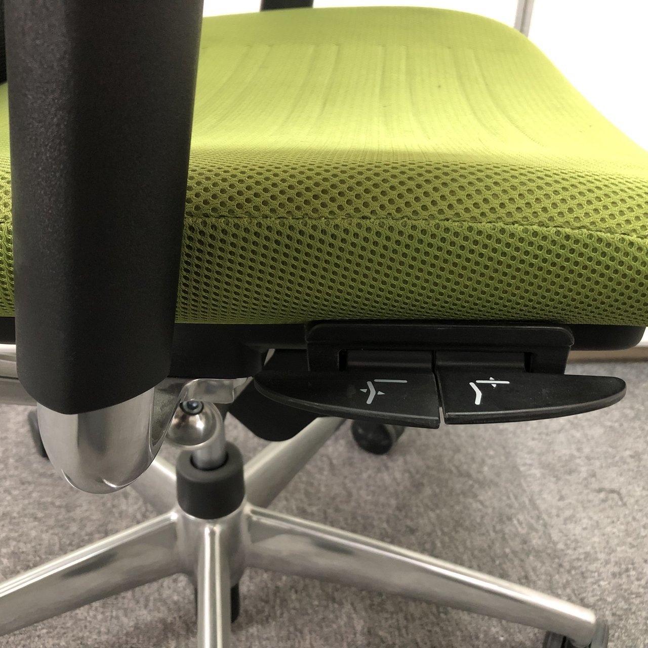 - 座る人の体格に合わせて、シート奥行きは前後54mm、高さ100mmの調整が可能です。また、調整レバーを座面シートの側面に設けることで、座ったままの姿勢で操作することができます。