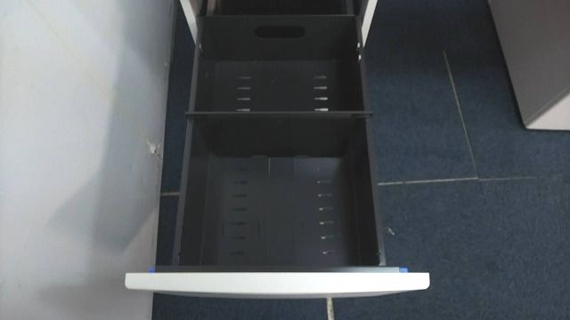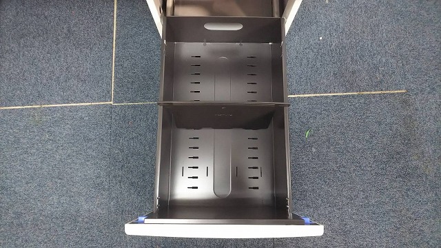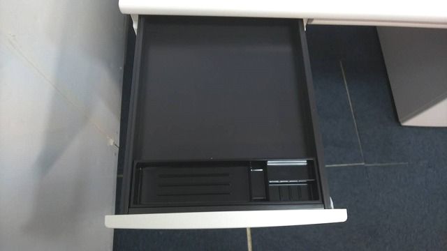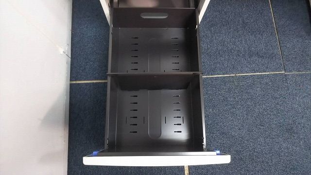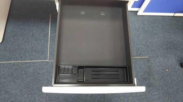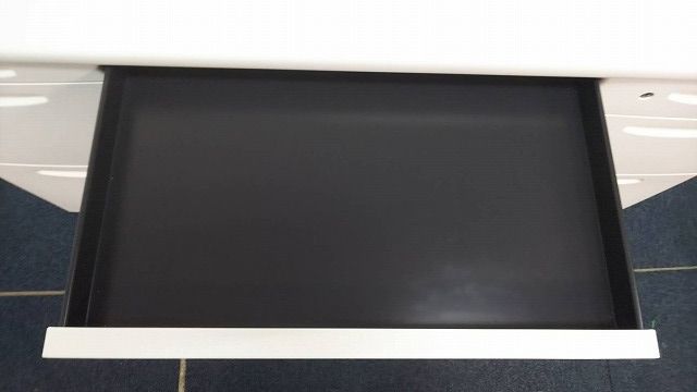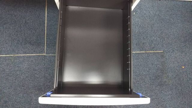 - 袖机のワゴンは、最下段がロング引出しになっており、従来より収納力120%アップ。