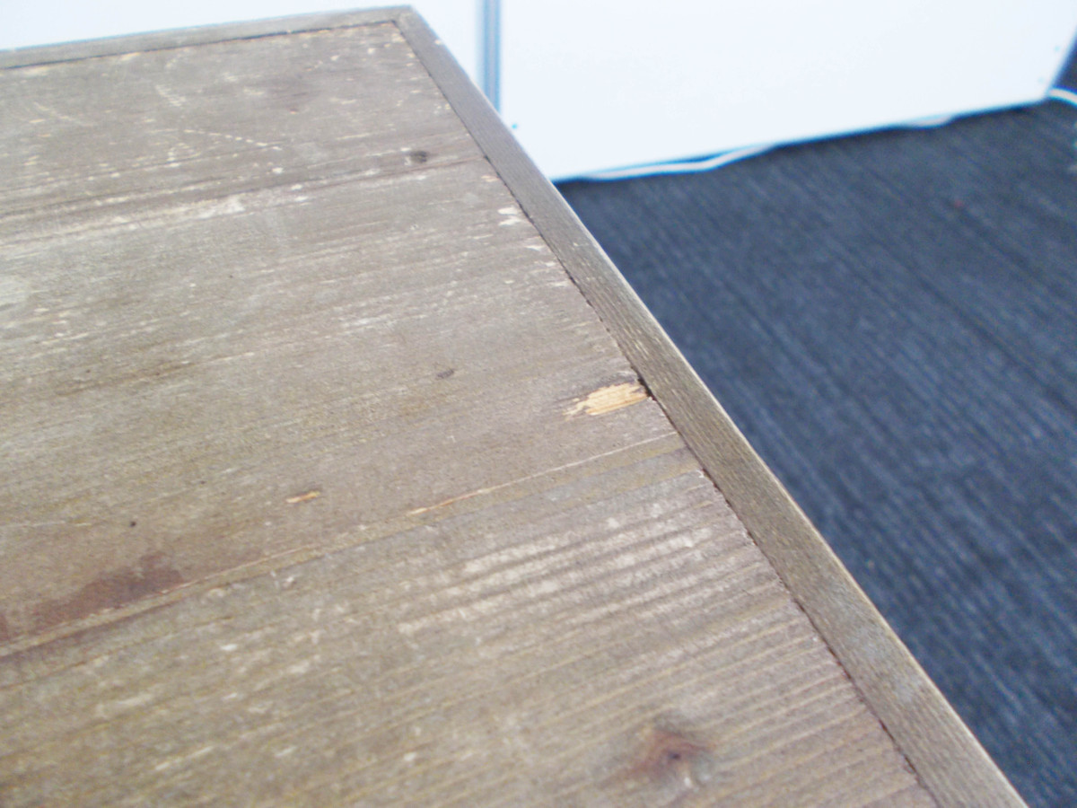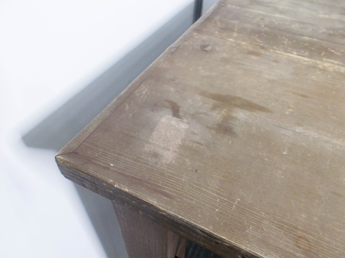 - 目立つ箇所複数あり深い傷・凹みが商品全体にある。(例、天板、幕板、棚板、サイド部分、脚部等にある。)