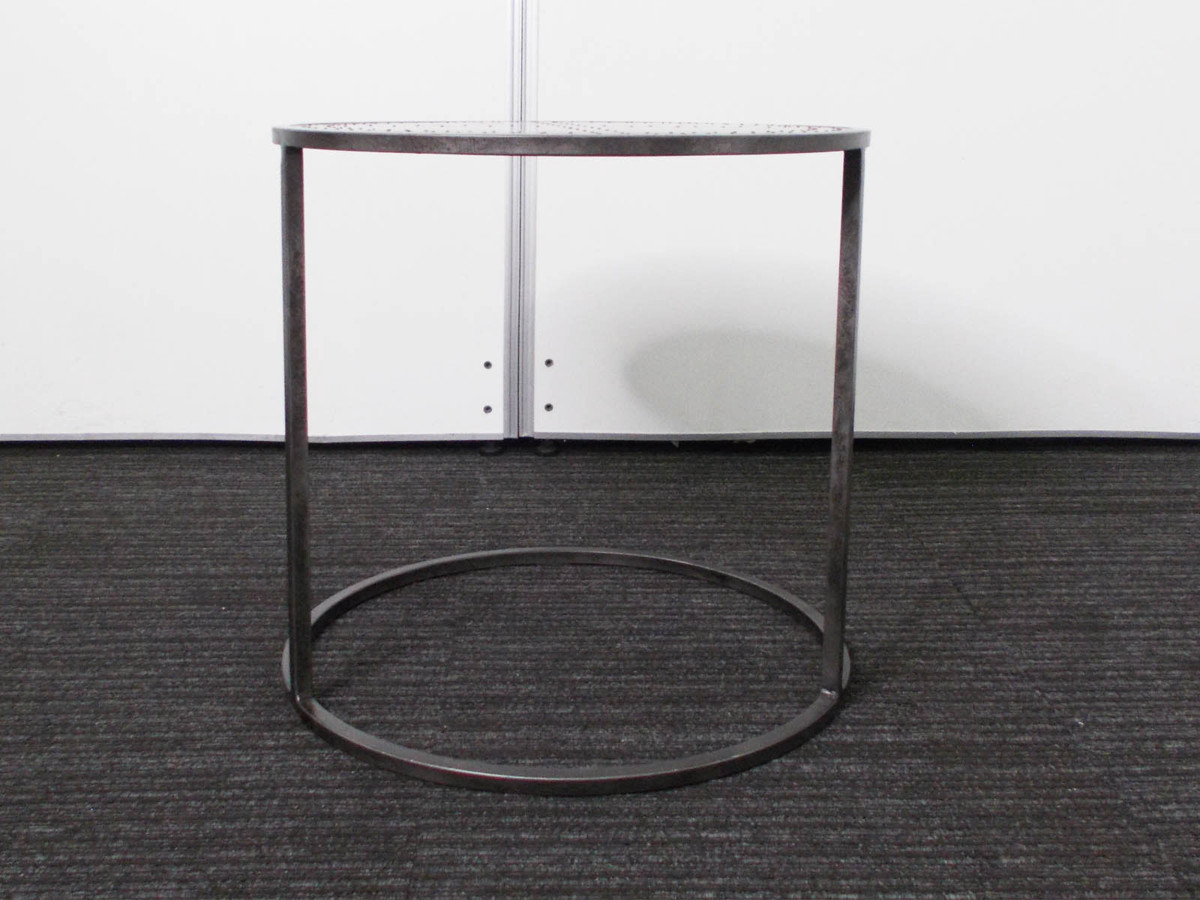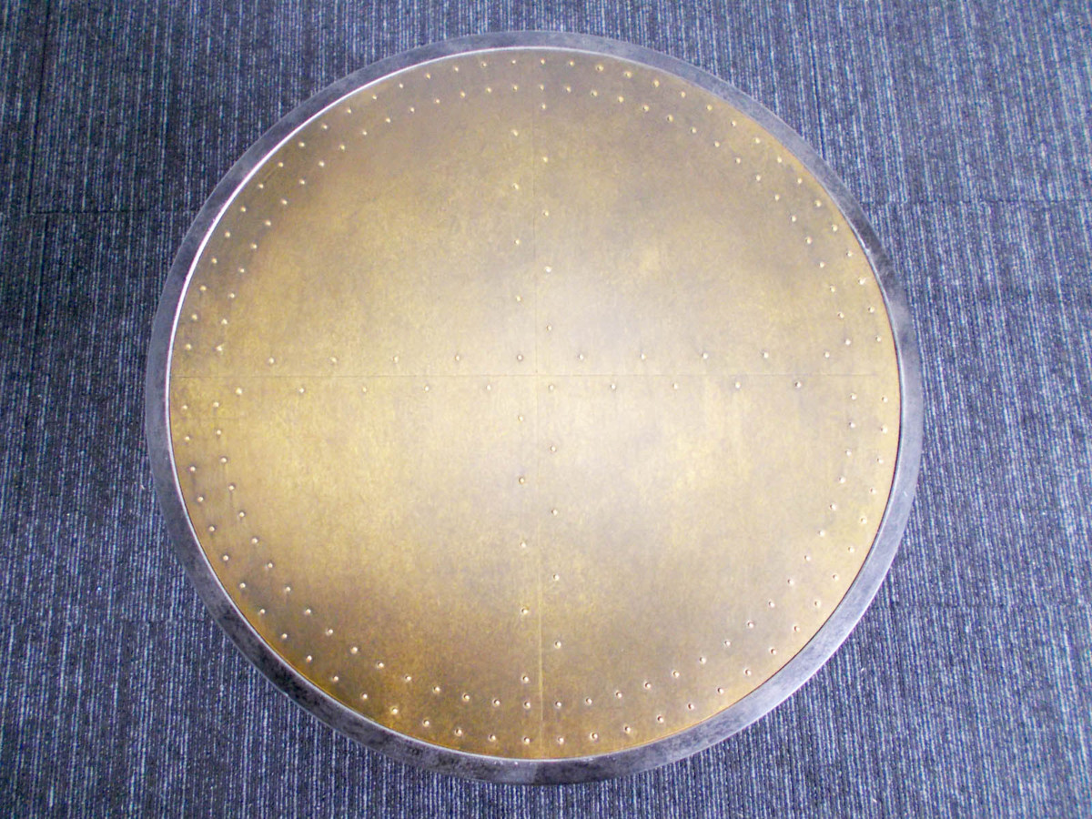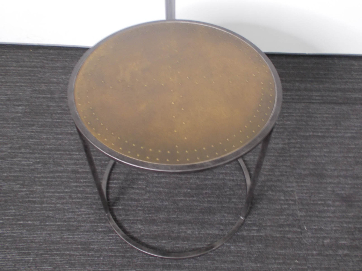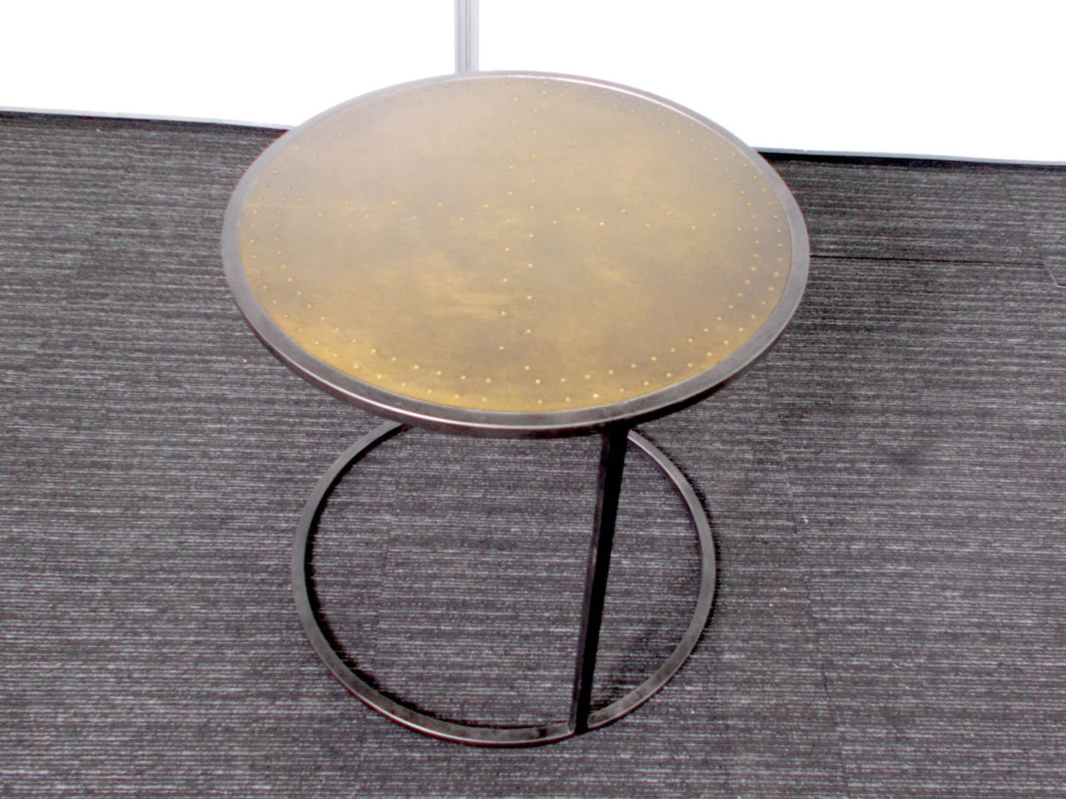 不規則な脚部のデザインにより、見る角度によって印象を変えるラウンドテーブル。天板には真鍮が張り込まれ、打ち込まれた鋲が無骨で工業的な雰囲気を高めてくれます。