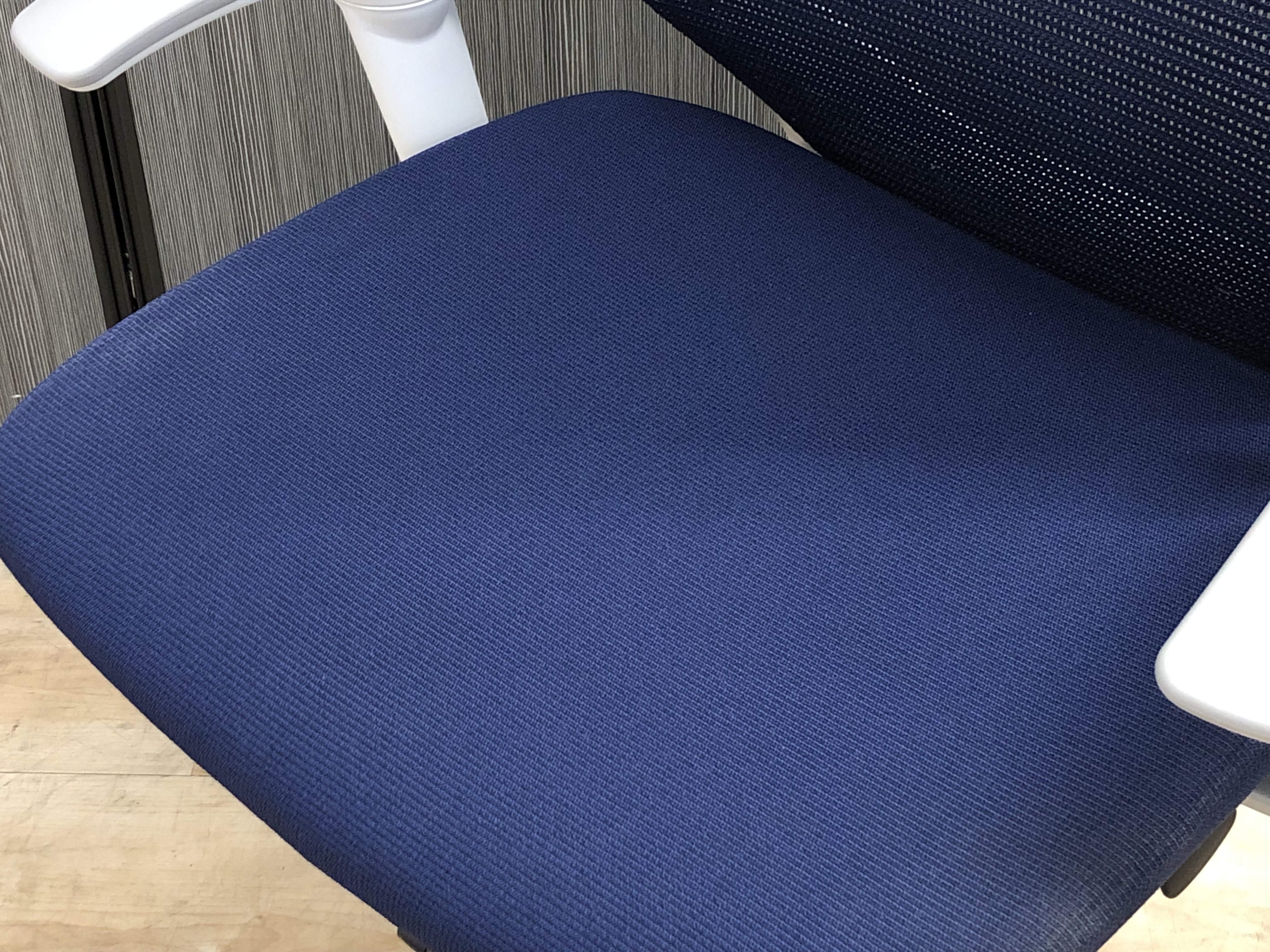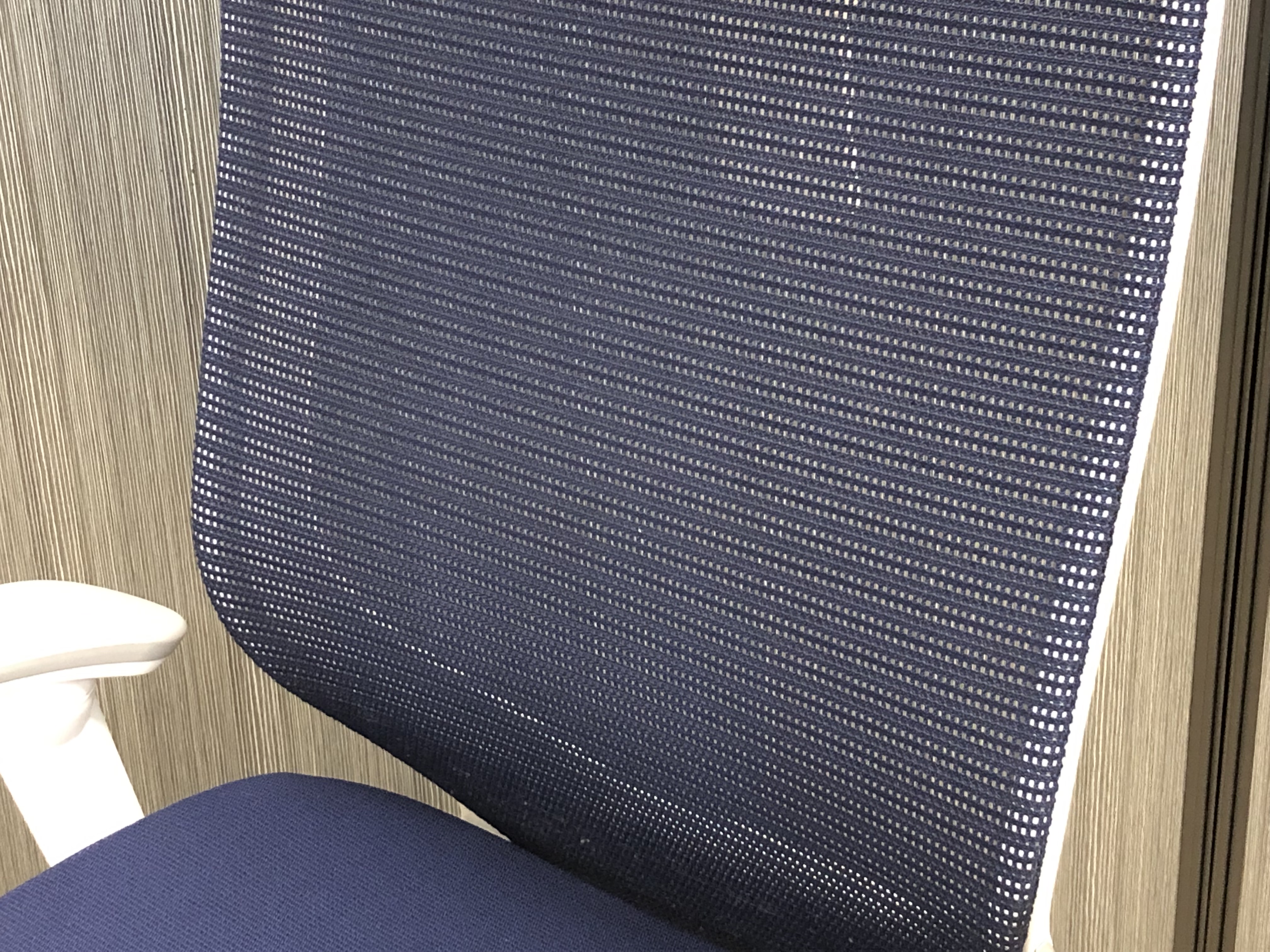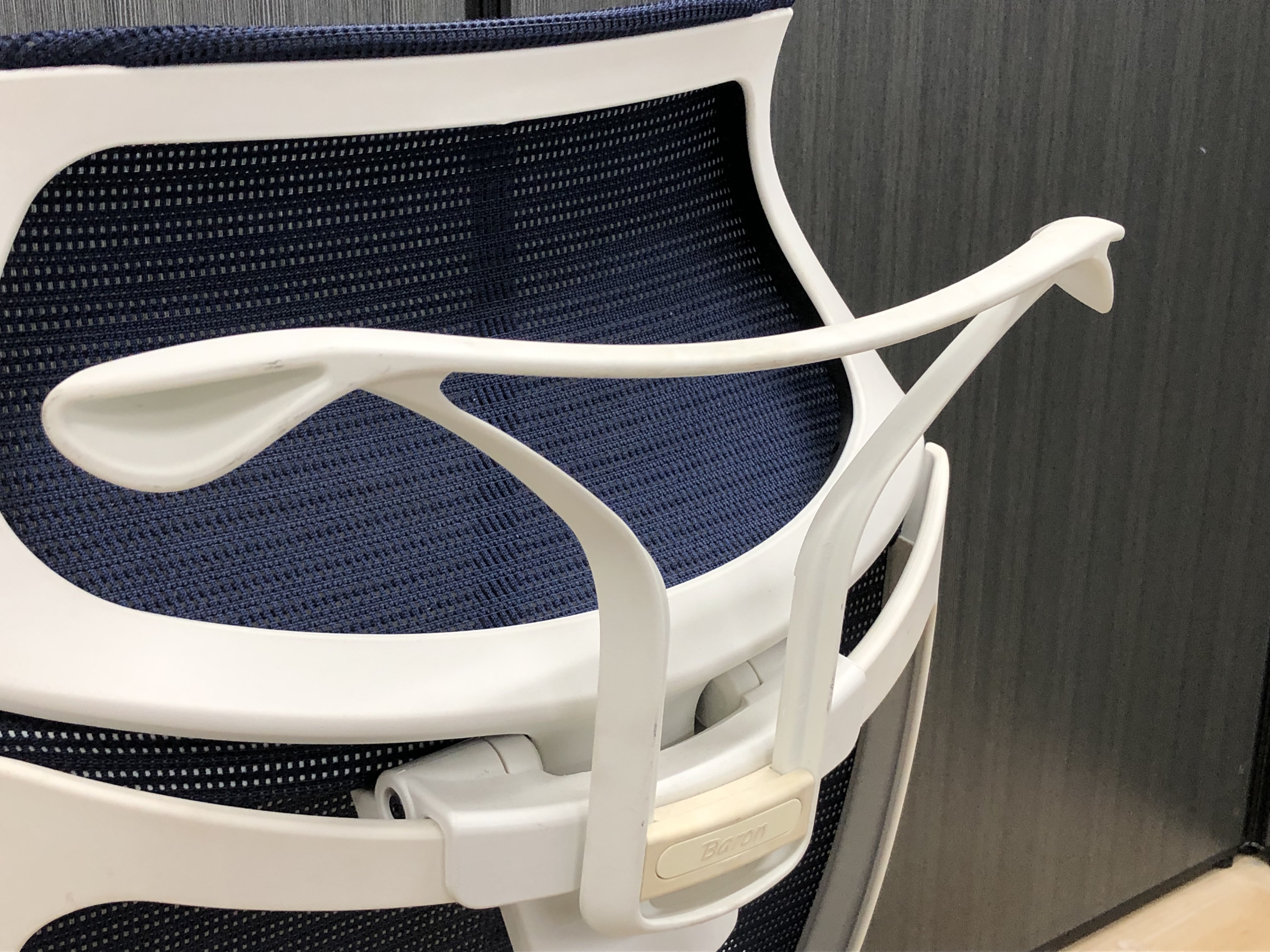 【2脚入荷】【オフィスの執務室、会議室におすすめ!】■オカムラ(okamura)製 バロン(Baron)チェア 肘付き ハイバック 背面メッシュ ■可動肘 ■ダークブルー × ホワイトシェル【硬めの座面が大人気!国産メッシュチェアの代表格!】