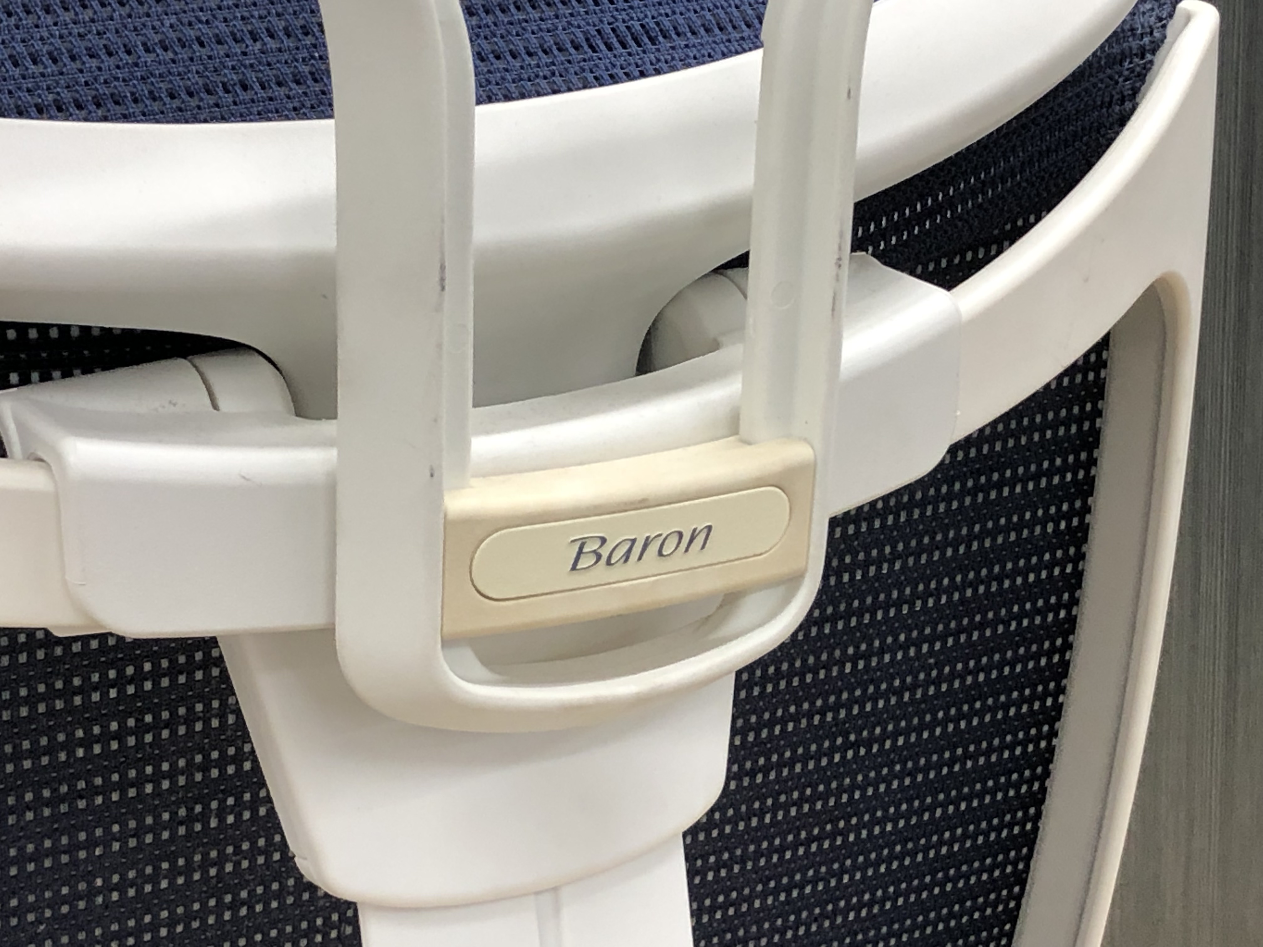 【4脚入荷】【オフィスの執務室、会議室におすすめ!】■オカムラ(okamura)製 バロン(Baron)チェア 肘付き ハイバック 背面メッシュ ■可動肘 ■ダークブルー × ホワイトシェル【硬めの座面が大人気!国産メッシュチェアの代表格!】