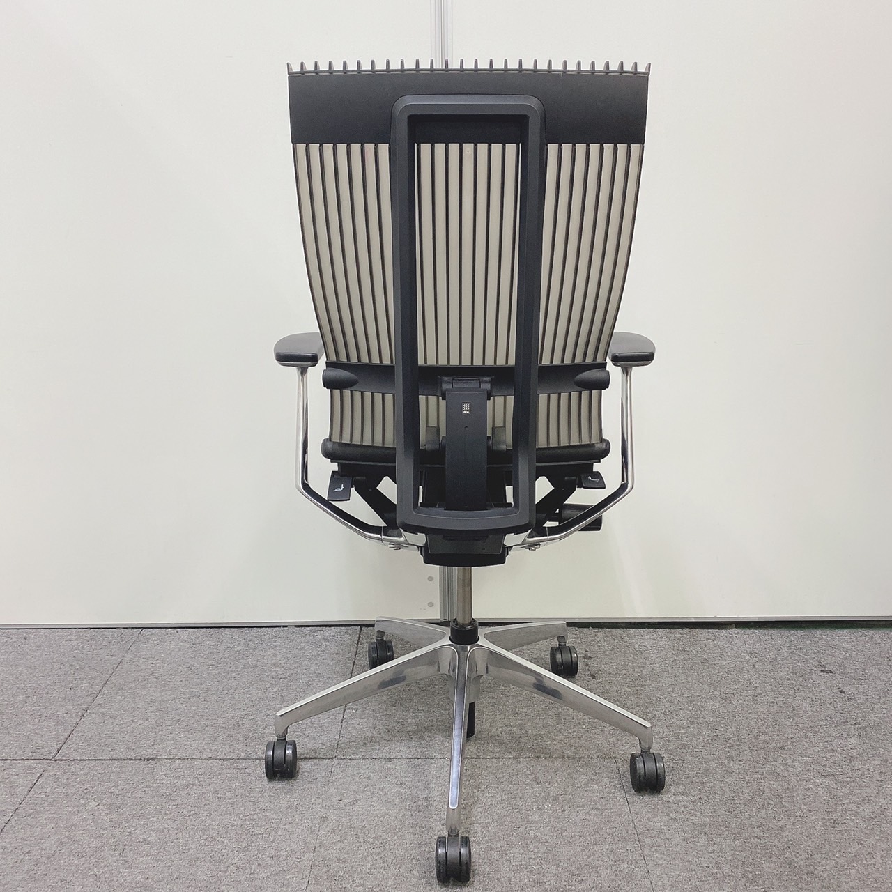 見た目は少し硬そうに見えるエラストマー素材ですが、座ってみると程よいしなり具合のやわらかな座り心地で、背中が痛くなるようなことはまるでありません。面ではなく線で支えることで、背面の通気性の良さは抜群です。