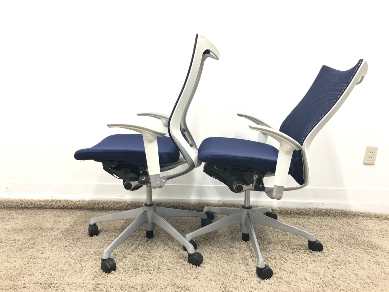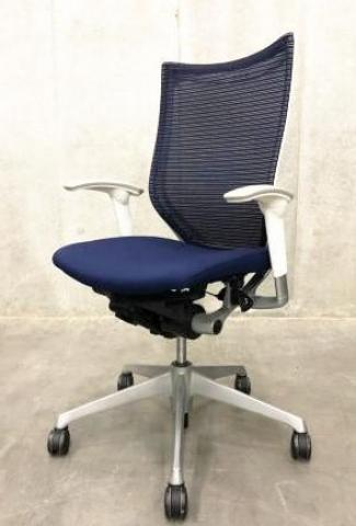 【オフィスの執務室、会議室におすすめ!】■オカムラ(okamura)製 バロン(Baron)チェア 肘付き ハイバック 背面メッシュ ■可動肘 ■ダークブルー × ホワイトシェル【硬めの座面が大人気!国産メッシュチェアの代表格!】【状態良好品!】