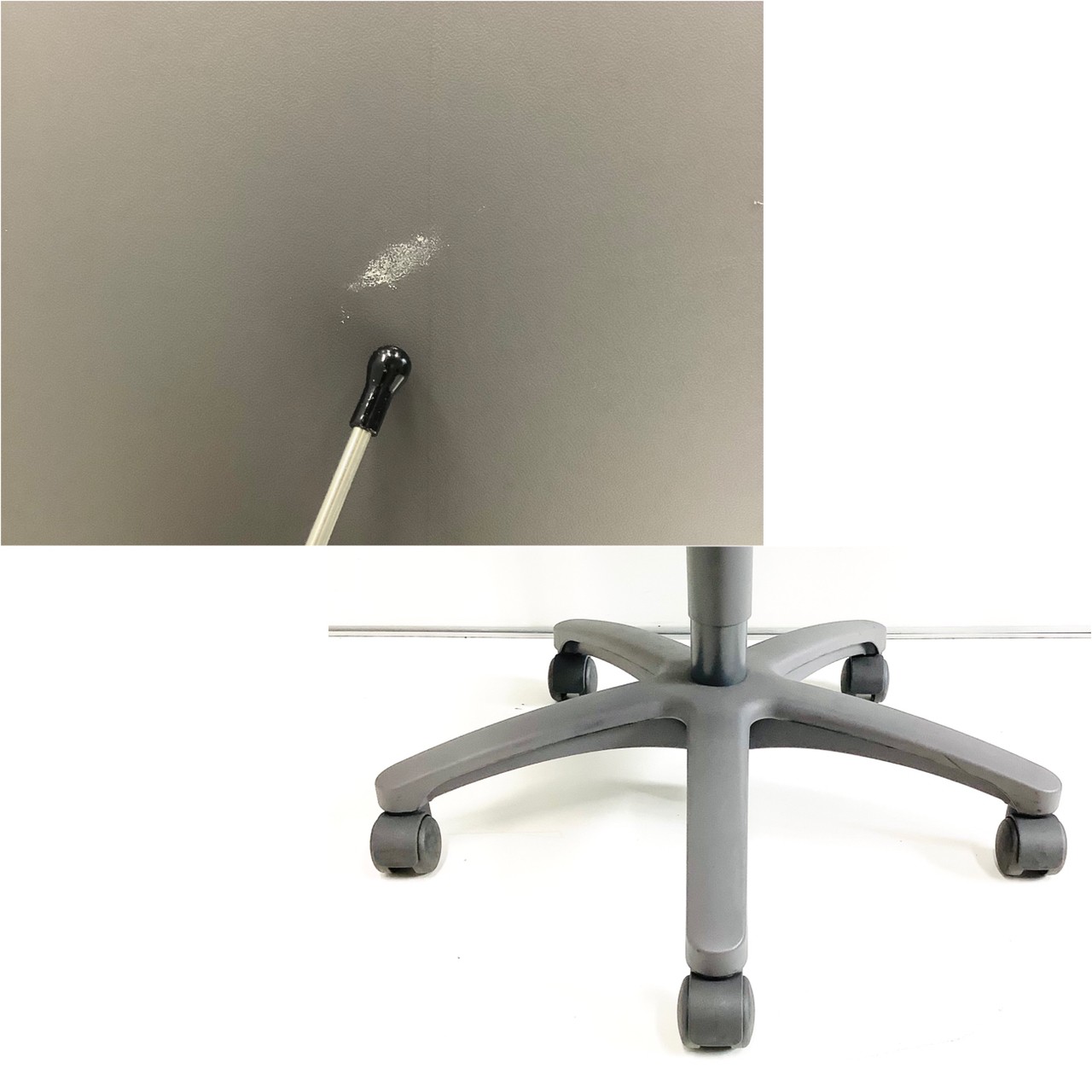 - あり黄ばみ・変色が広い範囲にうっすらある、または濃い黄ばみ・変色が一部ある。(例、座面・背もたれ、脚部等にある。)