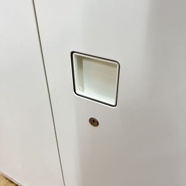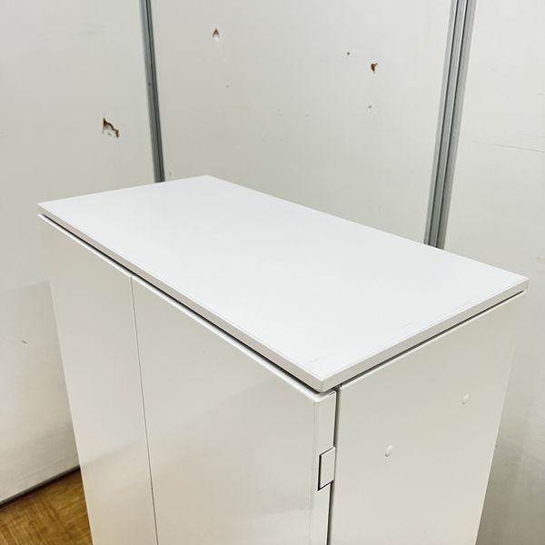 【オフィスの書類をスッキリ整理!取っ手がどの方向からでも開くマルチハンドル!】■オカムラ(okamura)製 レクトラインシリーズ 両開き書庫 ローキャビネット ■本体色:ホワイト ■シリンダー錠 ■ナチュラル天板付き