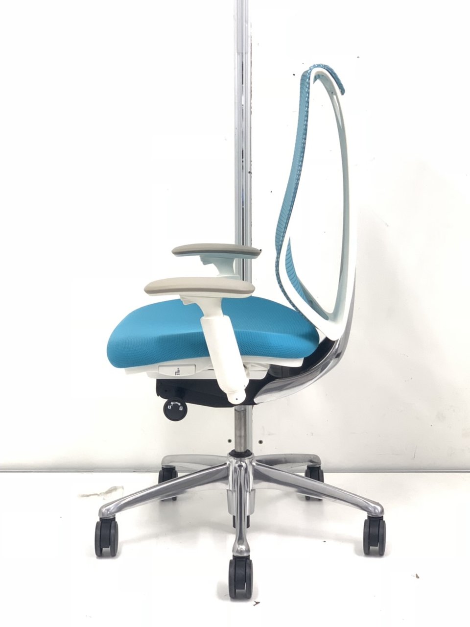 【T11】【T9】【K7】【商品入替のため、残り5脚限り】オカムラ製 サブリナシリーズ アクアブルー 背もたれ/アクアブルーx座面/ダークブルーのツートンカラー ホワイトフレーム アジャストアーム※可動肘 前傾チルト付 流れるような美しいフォルムの最高級メッシュチェア! 肘付きハイバックチェア!!