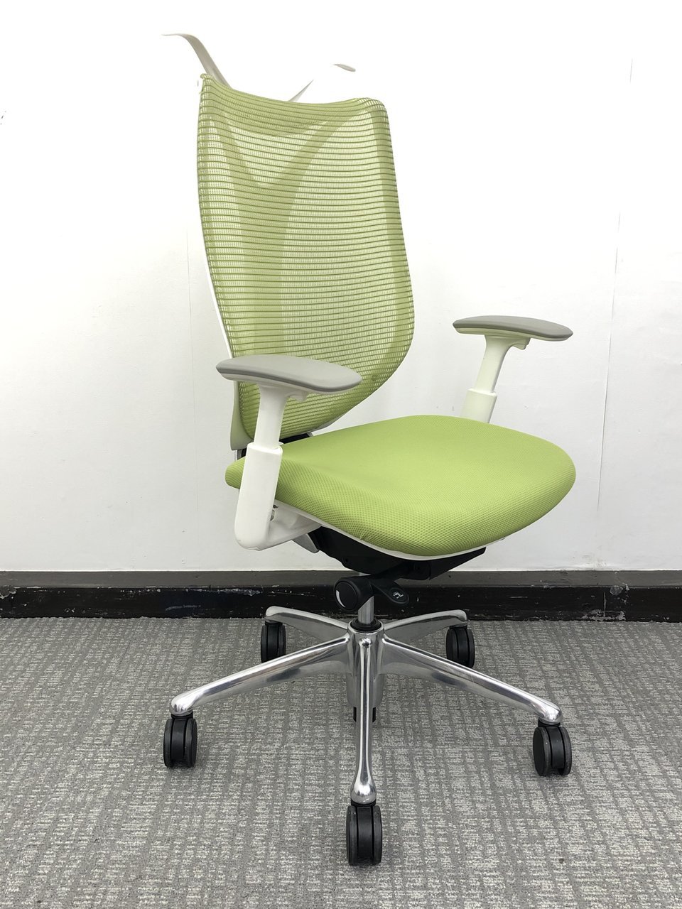 【美しい曲線&透明感のあるメッシュ】■オカムラ製 サブリナチェア ダークグリーン アジャストアーム付 ホワイトボディ ハンガー付【※外部倉庫在庫品(店頭在庫無)】【BR】