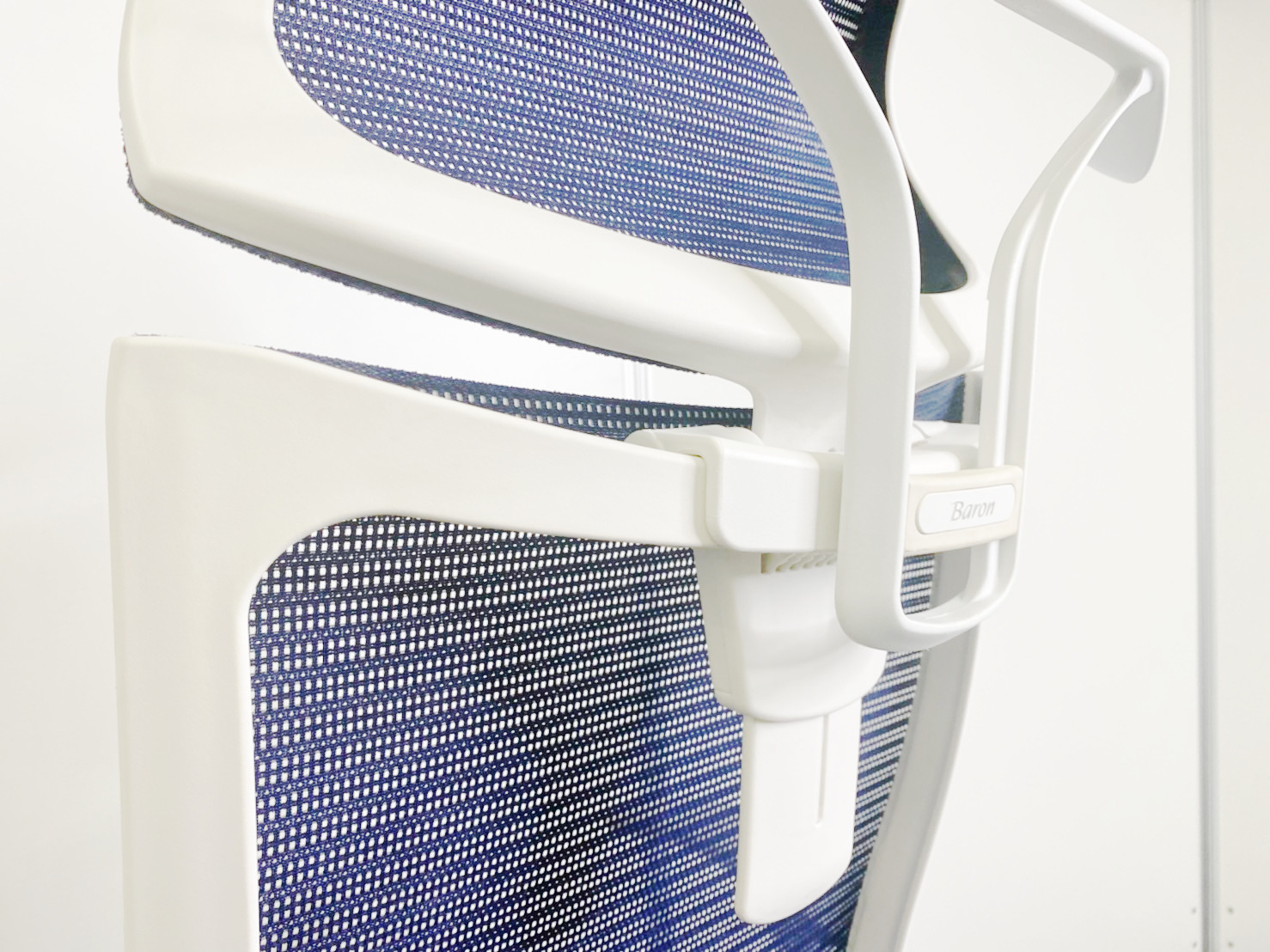 【オフィスの執務室、会議室におすすめ!】■オカムラ(okamura)製 バロン(Baron)チェア 肘付き ハイバック 背面メッシュ ■可動肘 ■ダークブルー × ホワイトシェル【硬めの座面が大人気!国産メッシュチェアの代表格!】【状態良好品!】