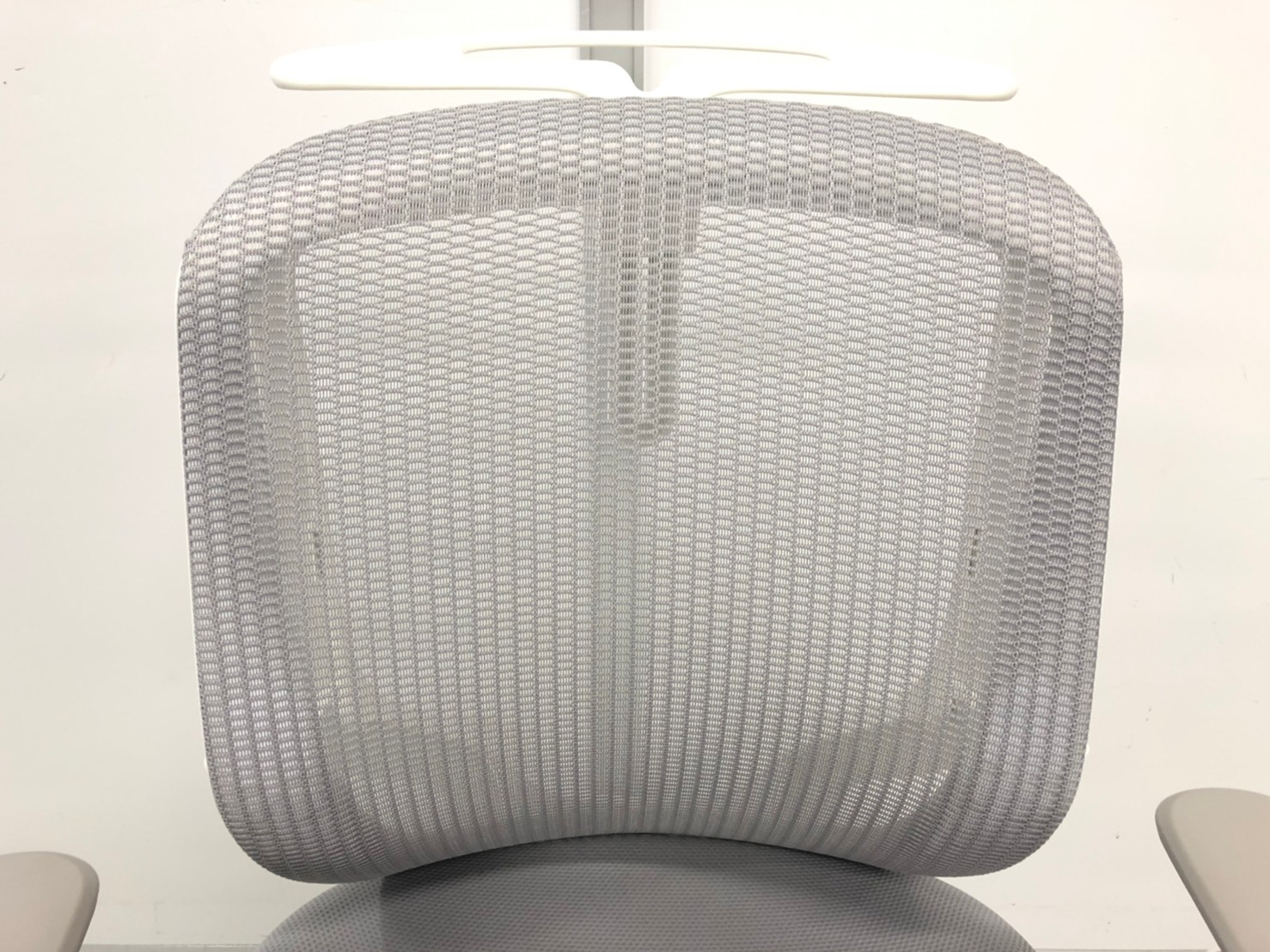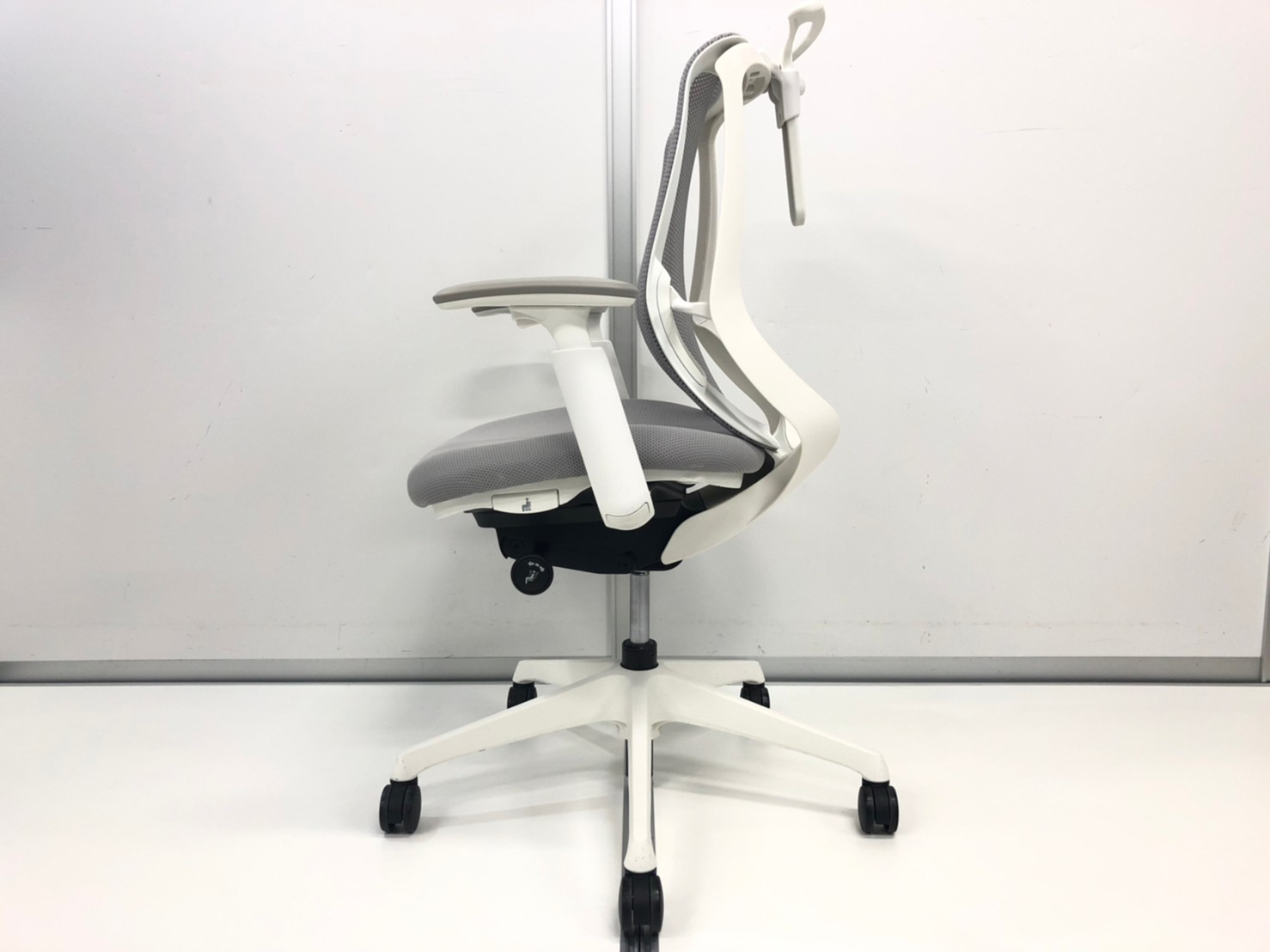 【1脚限定の為、クレジット決済優先!】オカムラ製 シルフィーシリーズ ライトグレー ホワイトフレーム デザインアーム※固定肘 コートハンガー 樹脂脚 メッシュ仕様 大人気前傾チェア 背のカーブを変えられる新感覚のオフィスシーティング 肘付きローバックチェア!!