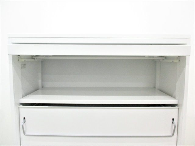 フラップ扉を開けた内部にも収納スペースがあるキャビネットです。