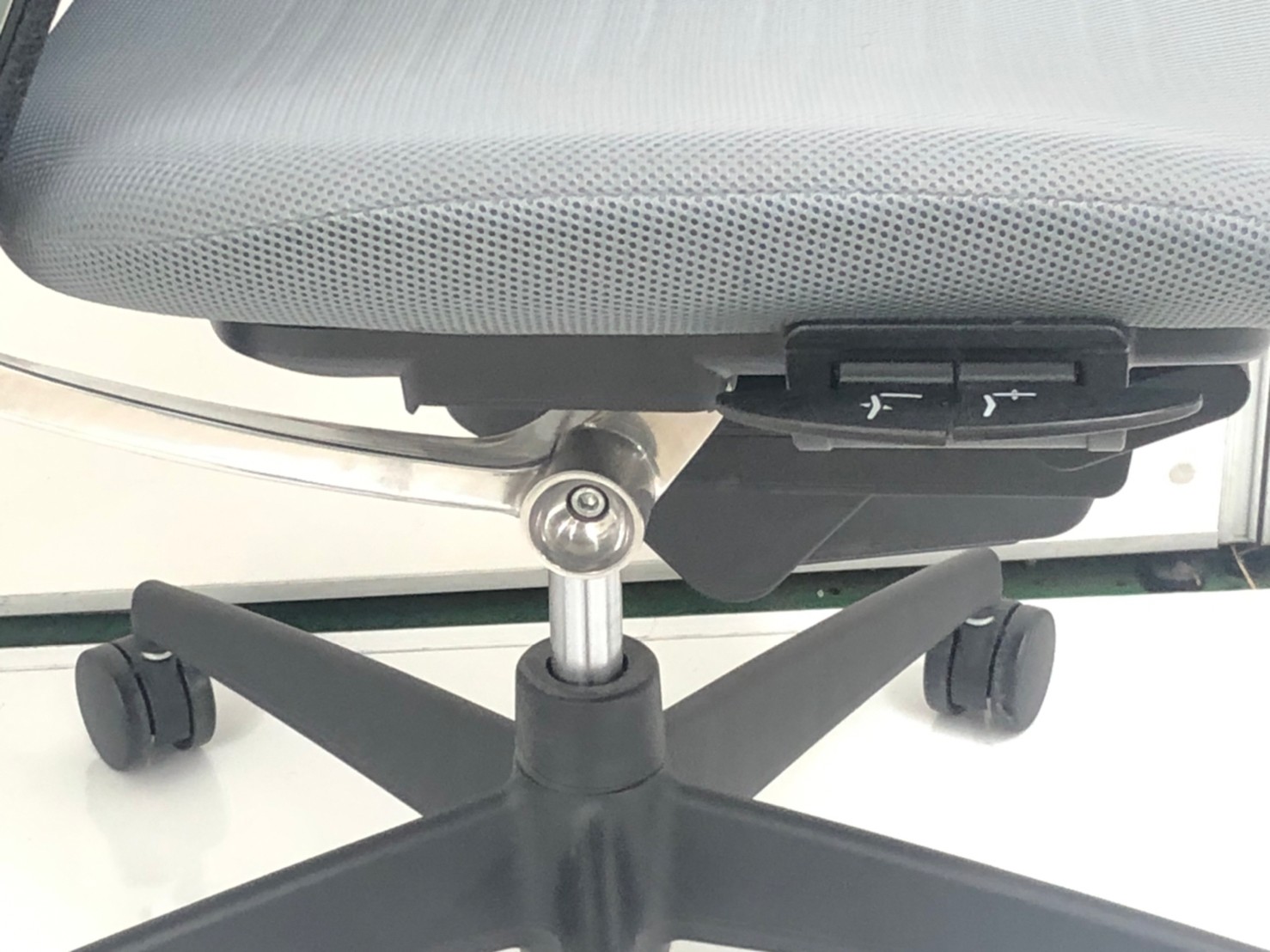 - 座る人の体格に合わせて、シート奥行きは前後54mm、高さ100mmの調整が可能です。また、調整レバーを座面シートの側面に設けることで、座ったままの姿勢で操作することができます。