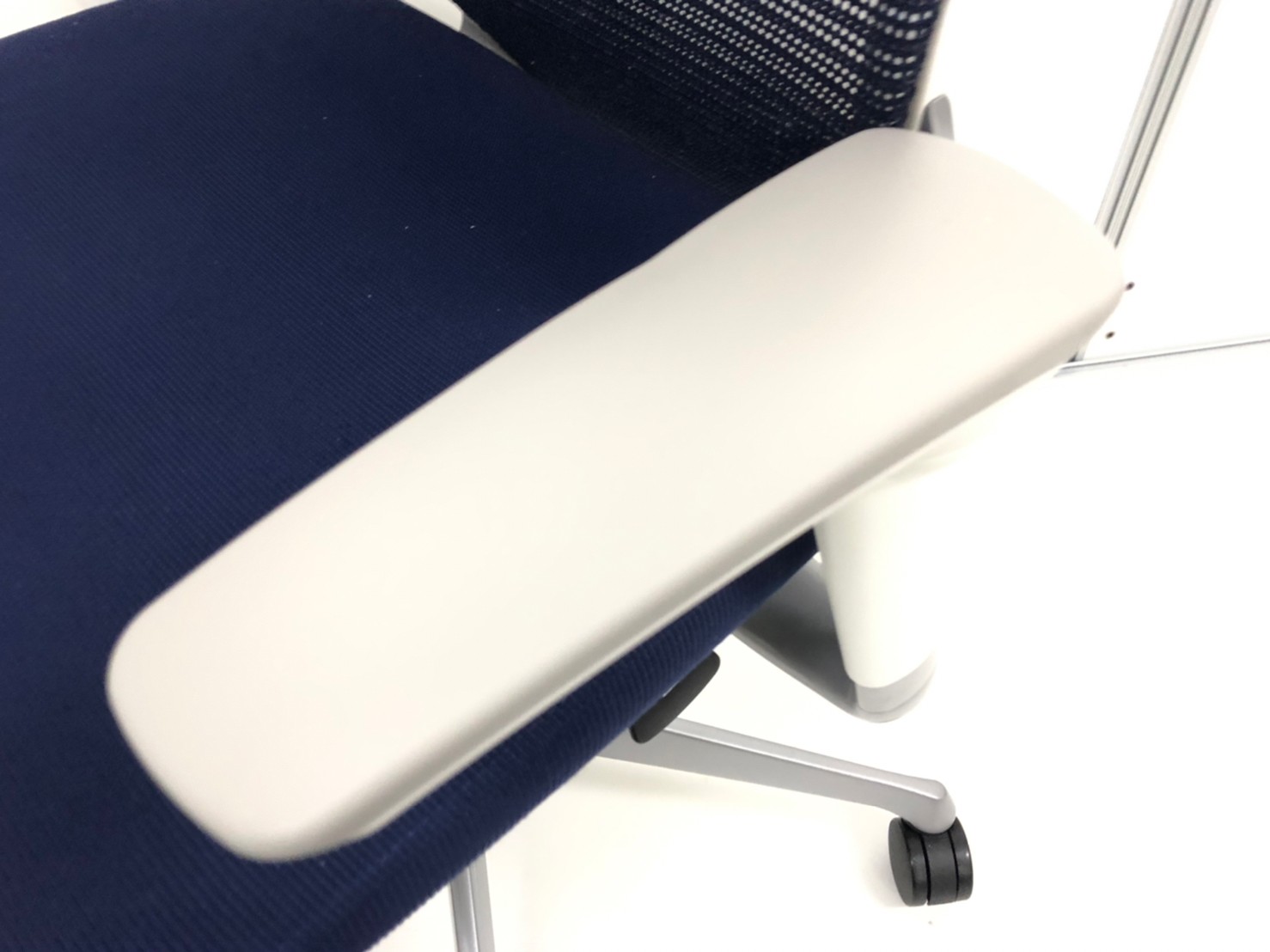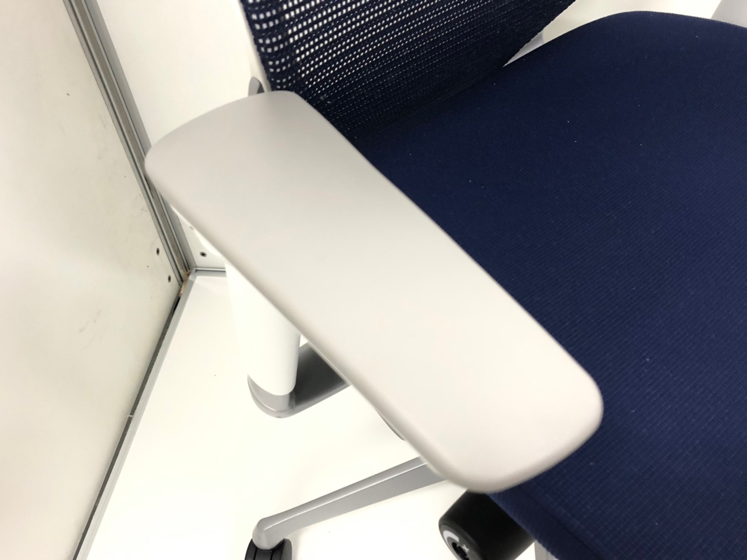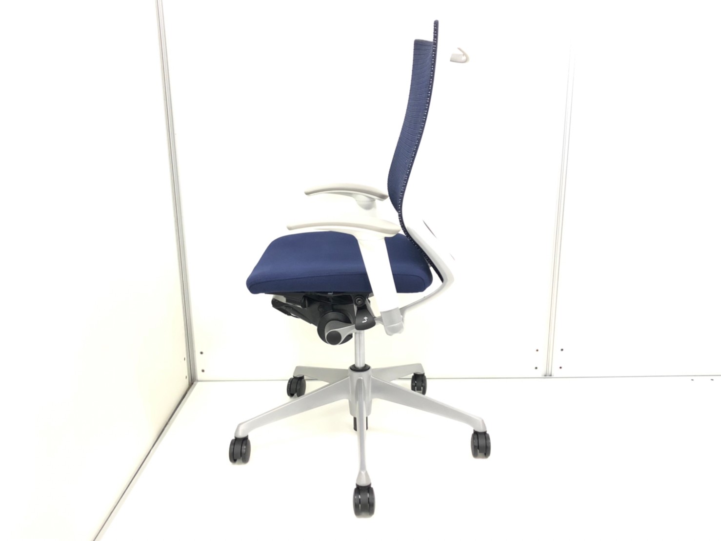【オフィスの執務室、会議室におすすめ!】■オカムラ(okamura)製 バロン(Baron)チェア 肘付き ハイバック 背面メッシュ ■可動肘 ■ダークブルー × ホワイトシェル【硬めの座面が大人気!国産メッシュチェアの代表格!】【状態良好品!】