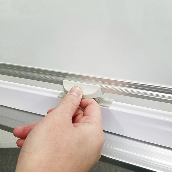 ホワイトボードの板面は、回転して両面を簡単に切り替えることができ、固定も簡単にできます。
