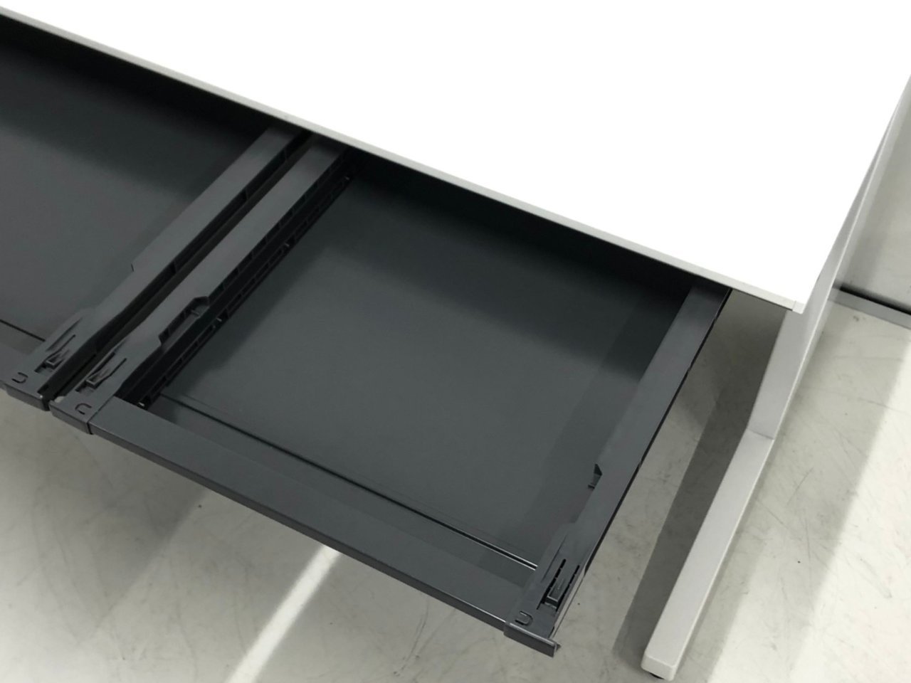 - 地震時、センター引出しが飛び出さないよう、ラッチ機構を装備。脚はデスクの横ズレを軽減させる設計になっています。