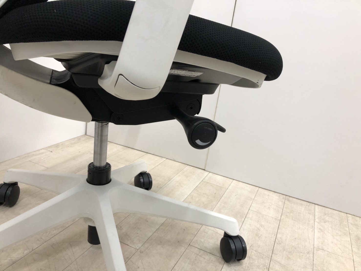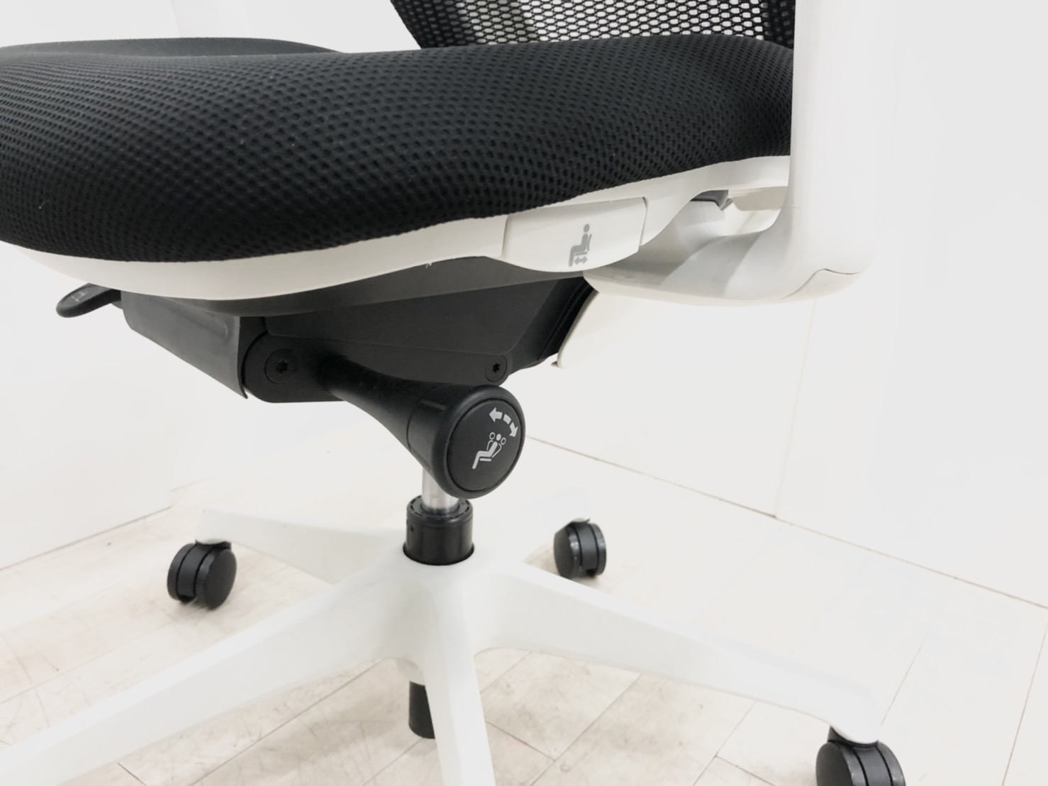 - 座面左下のダイヤルでリクライニングの固定と解除が行えます。 前傾ポジションをとることも可能です。