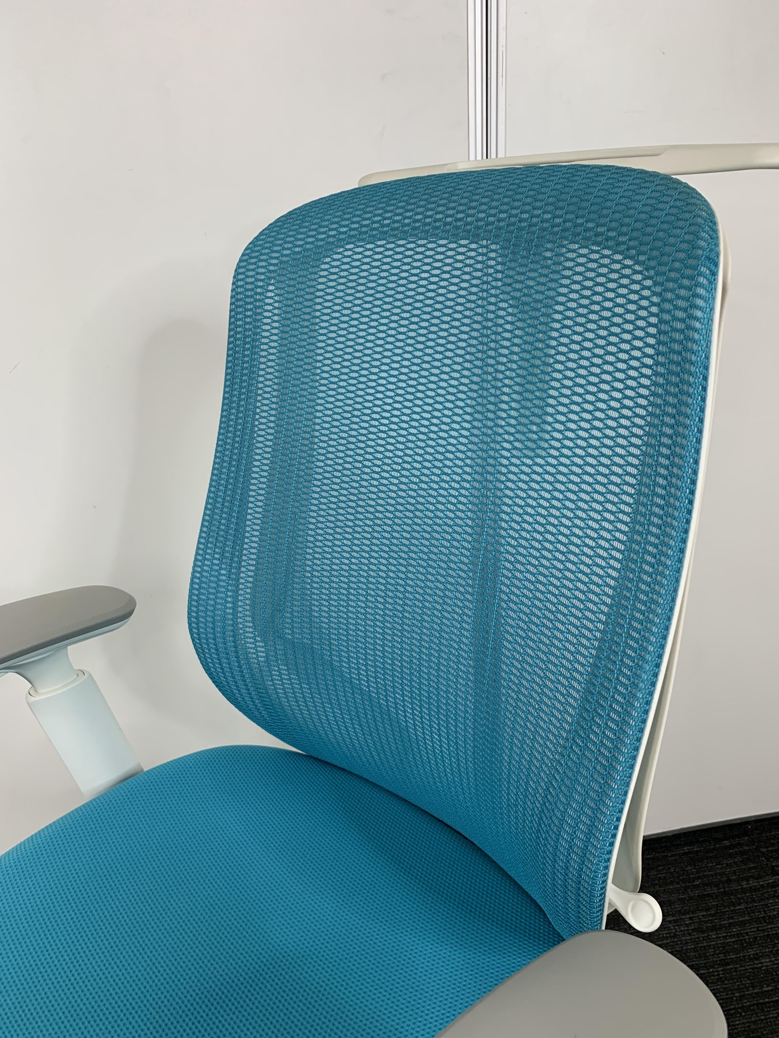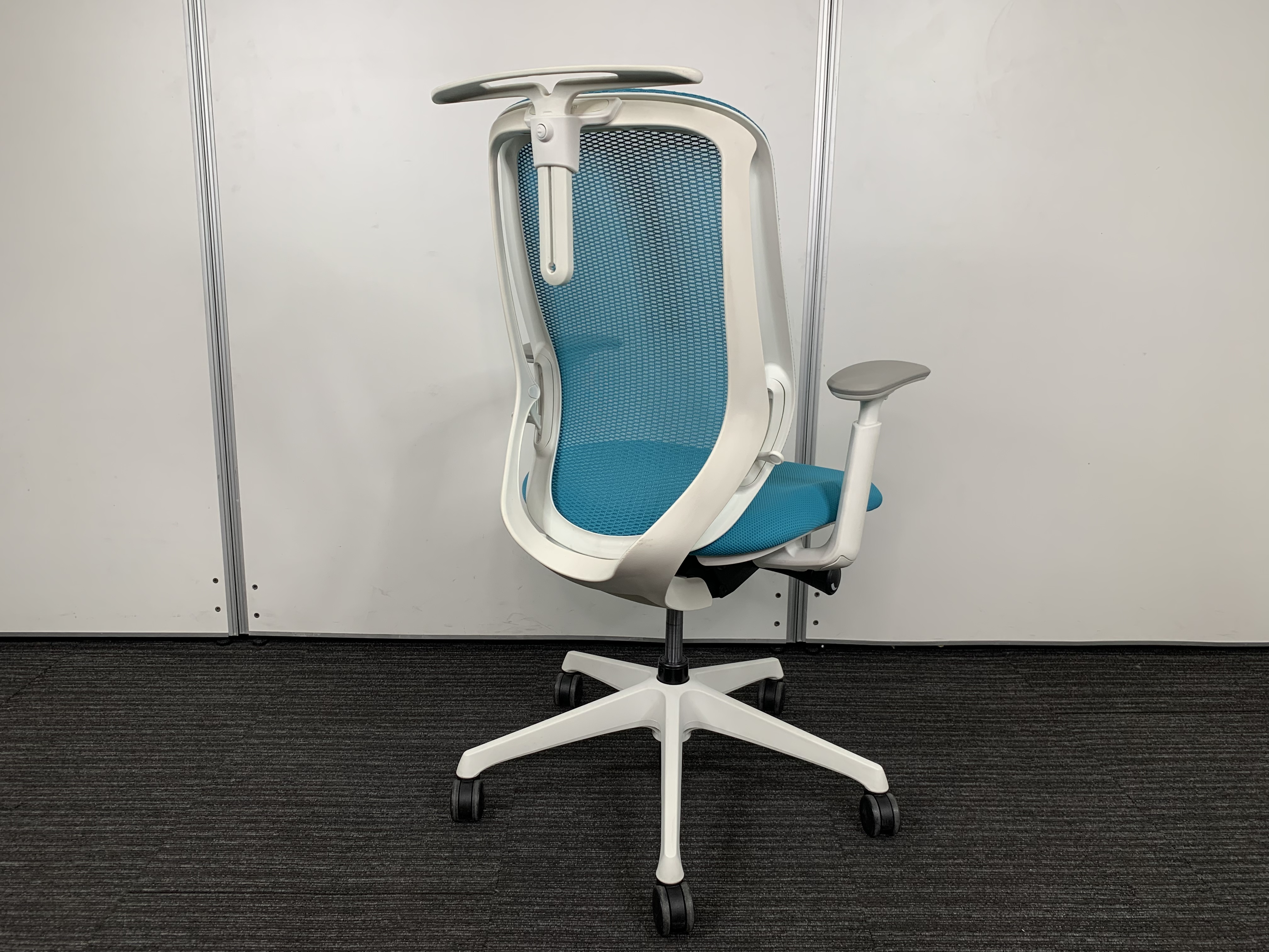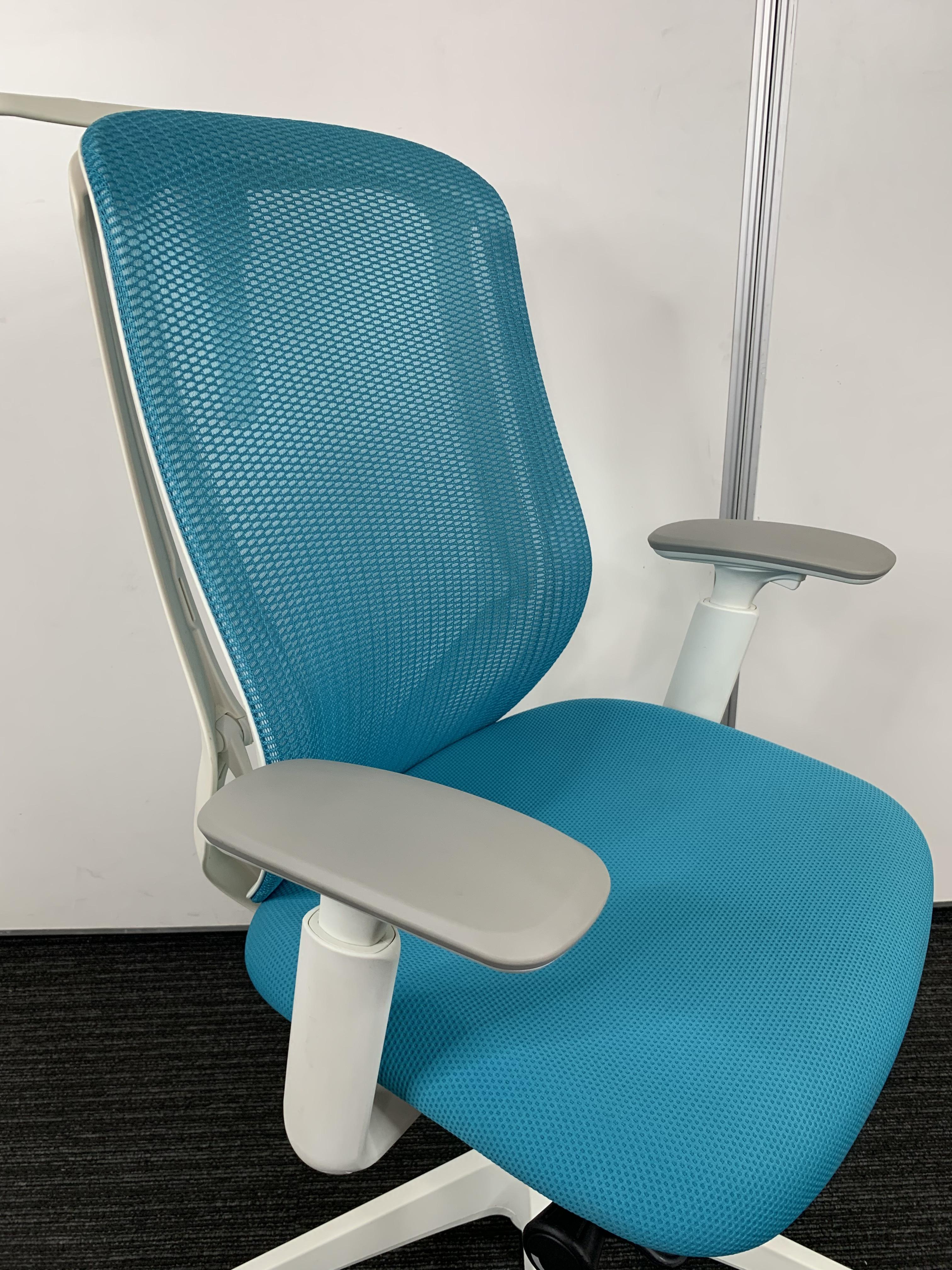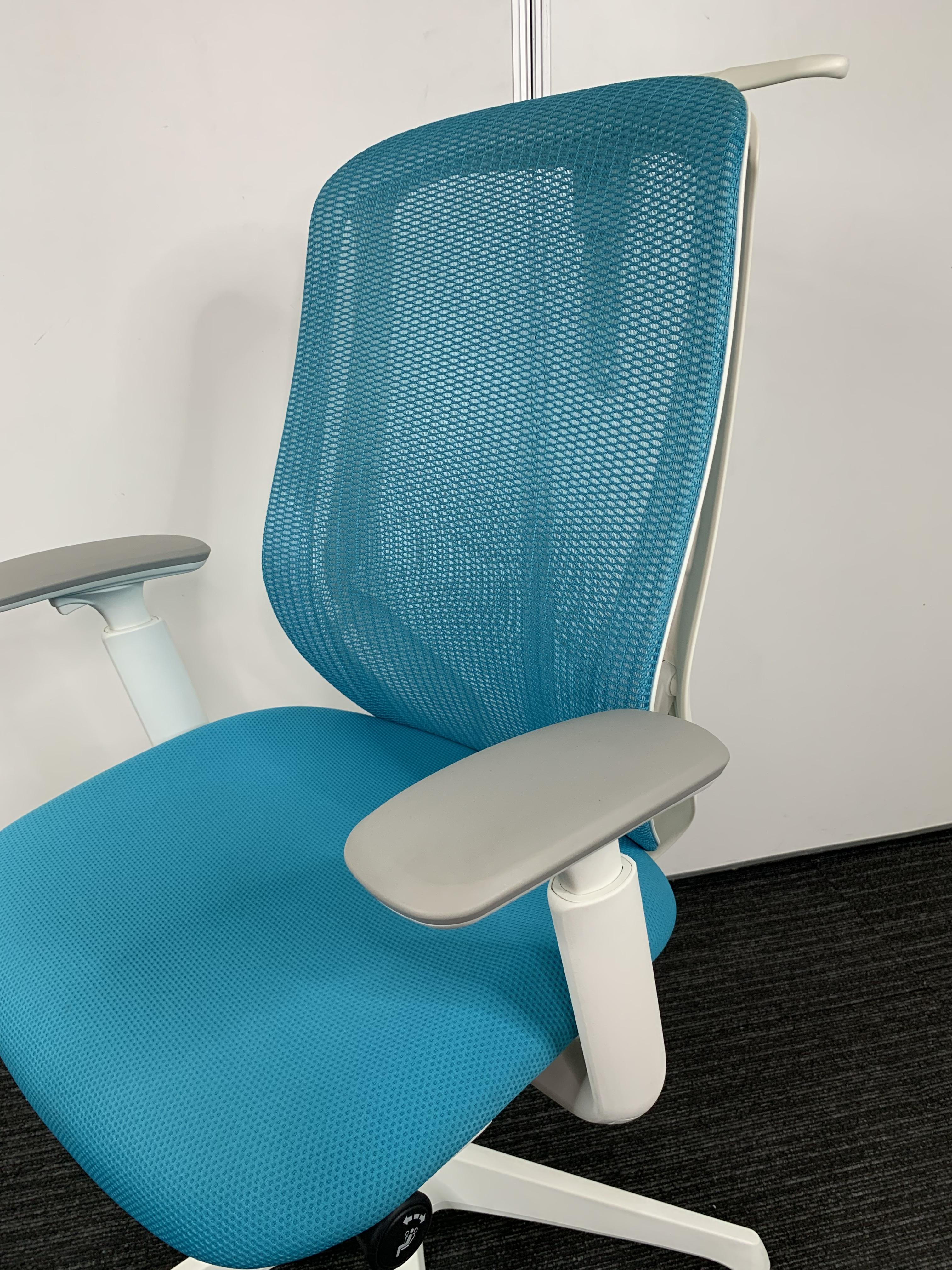 《現物写真だから安心!》オカムラ製の人気オフィスチェア【シルフィーメッシュ/可動肘/ヘッドレスト付き/ブルーグリーン】が先着1名様ご案内可能です!