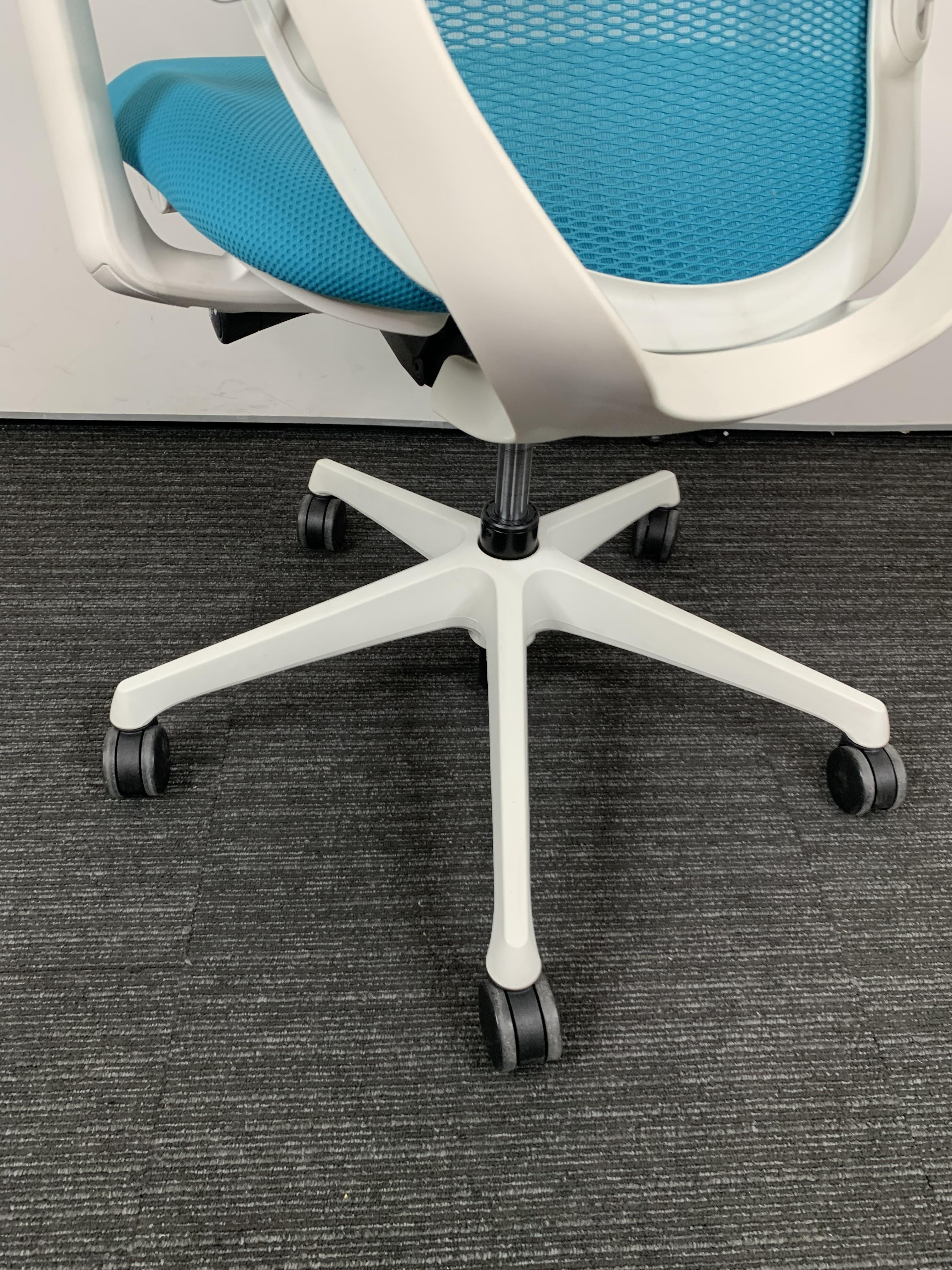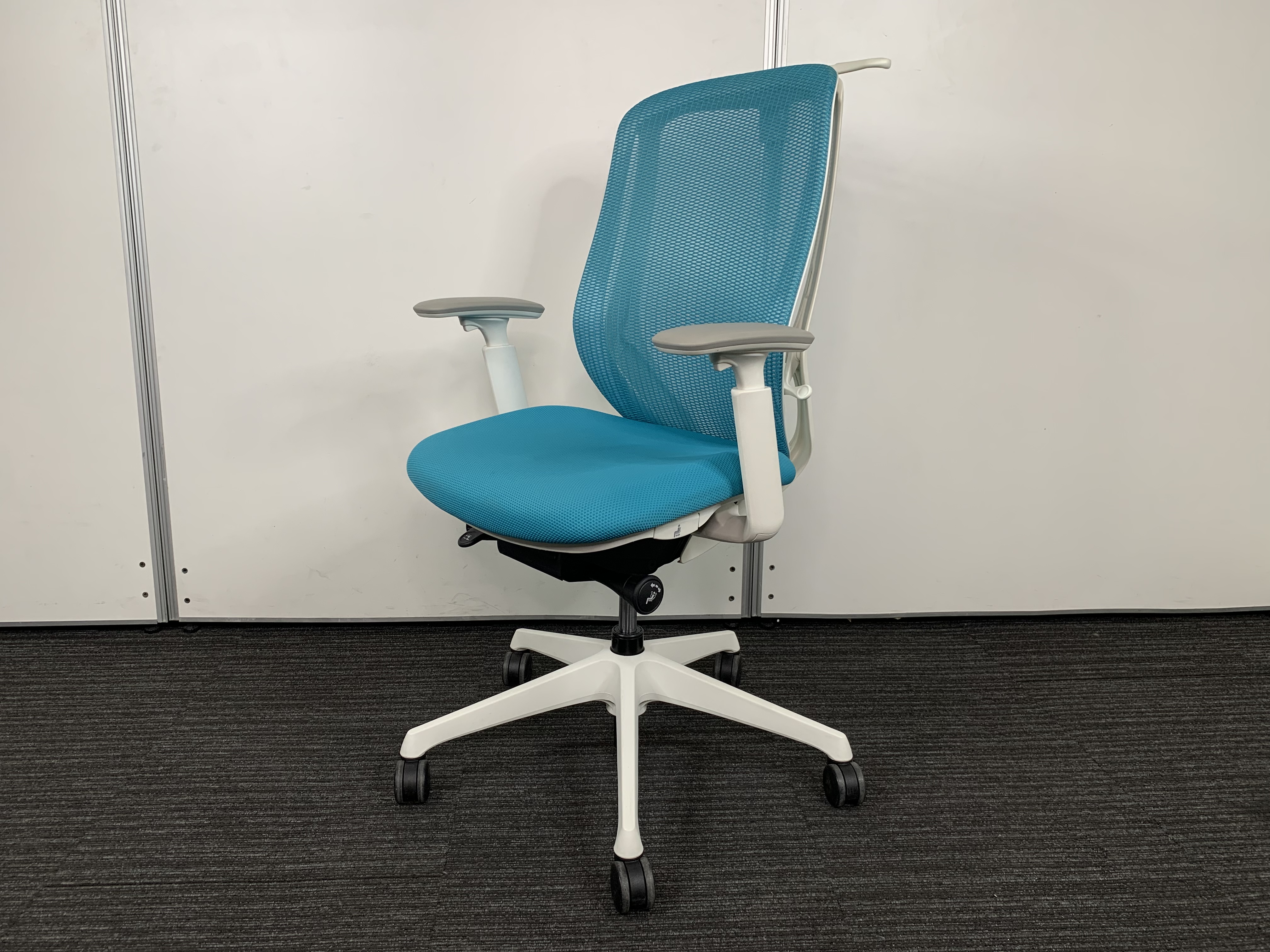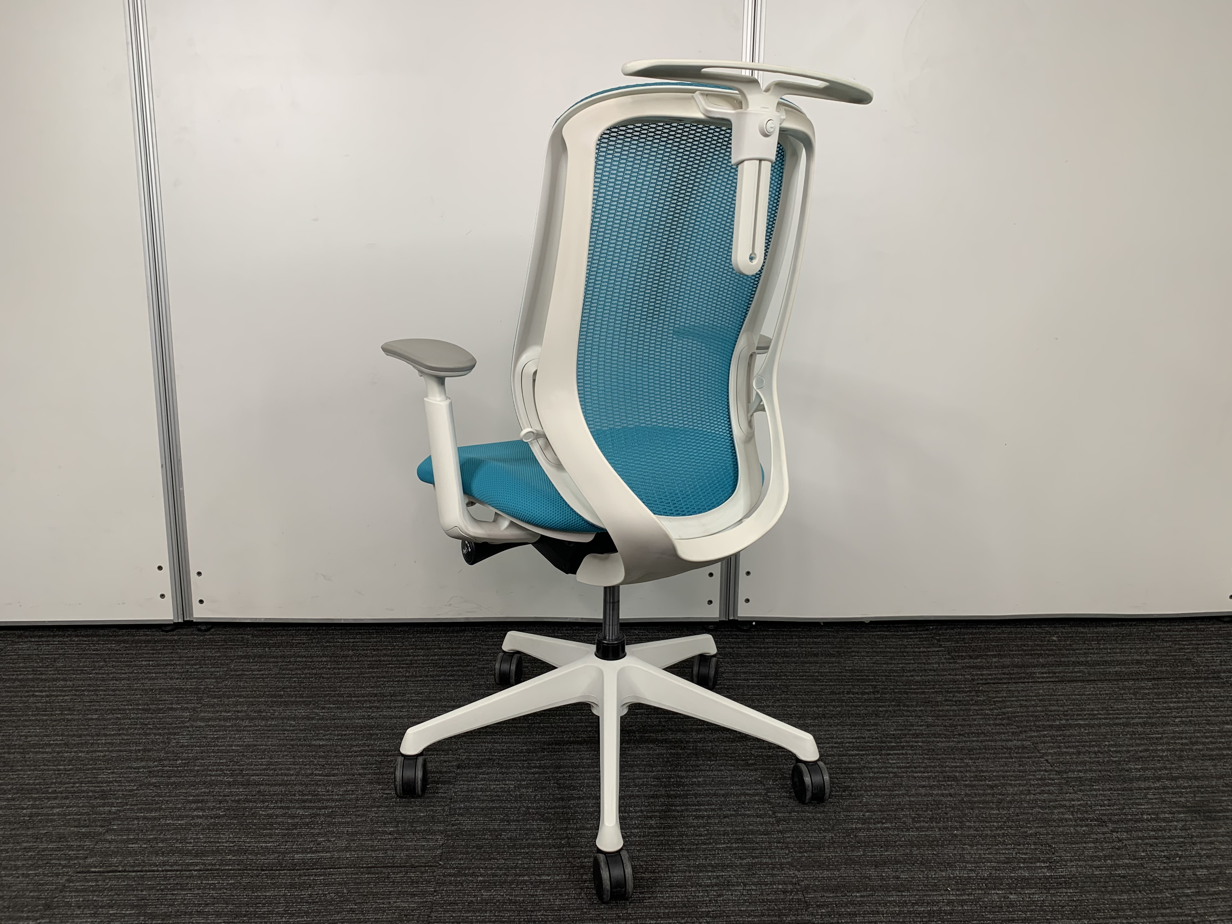 《現物写真だから安心!》オカムラ製の人気オフィスチェア【シルフィーメッシュ/可動肘/ヘッドレスト付き/ブルーグリーン】が先着1名様ご案内可能です!