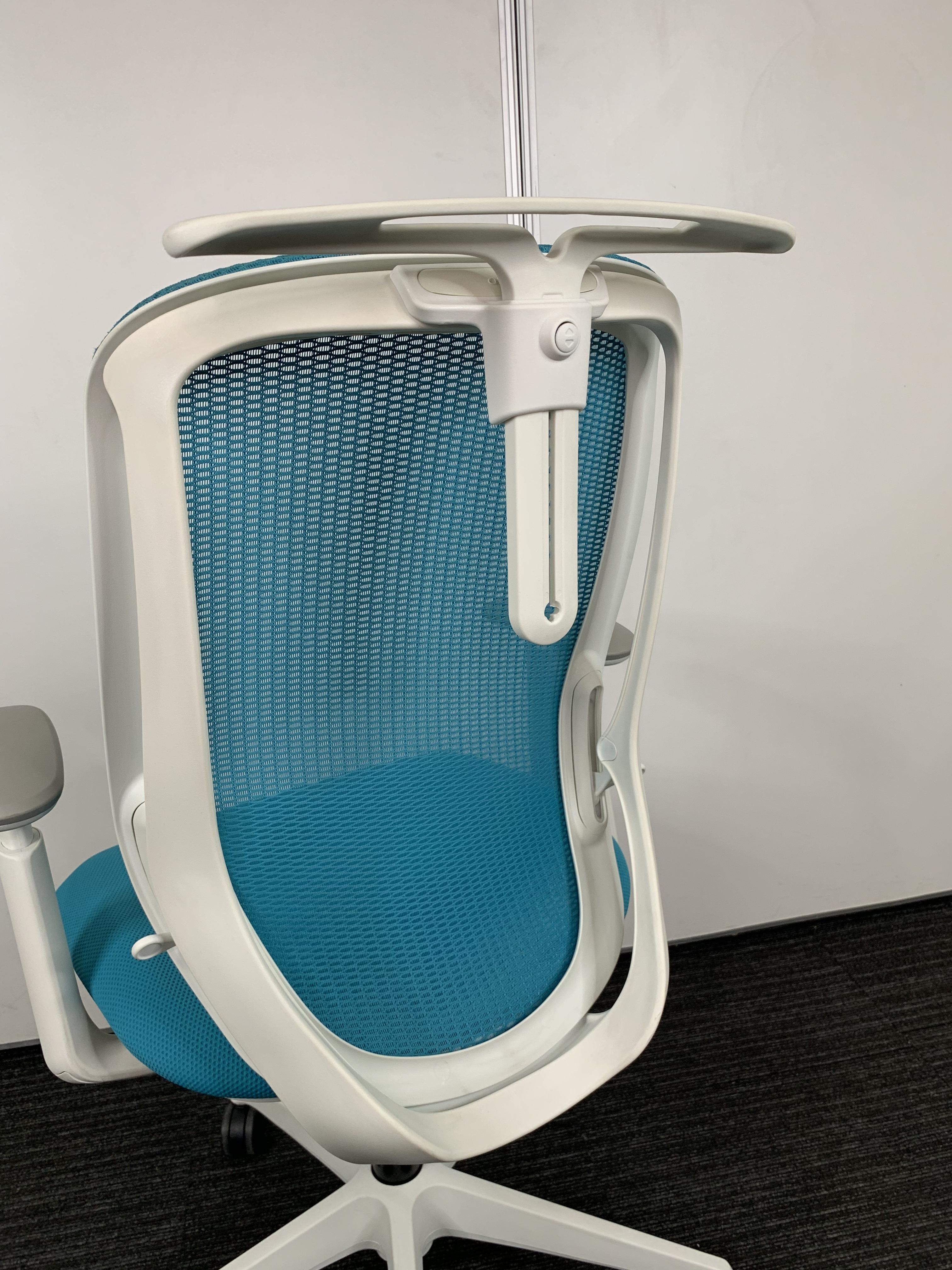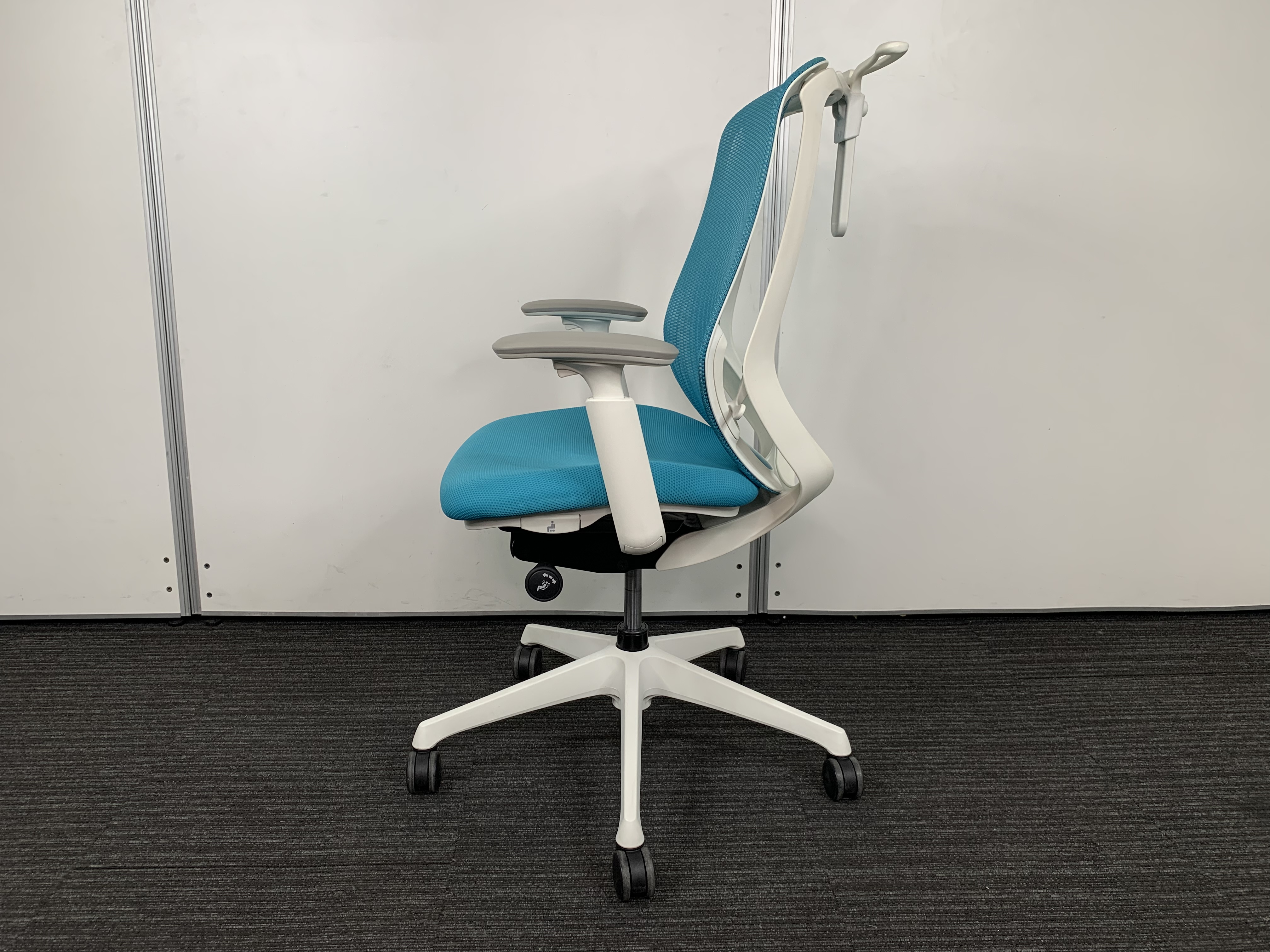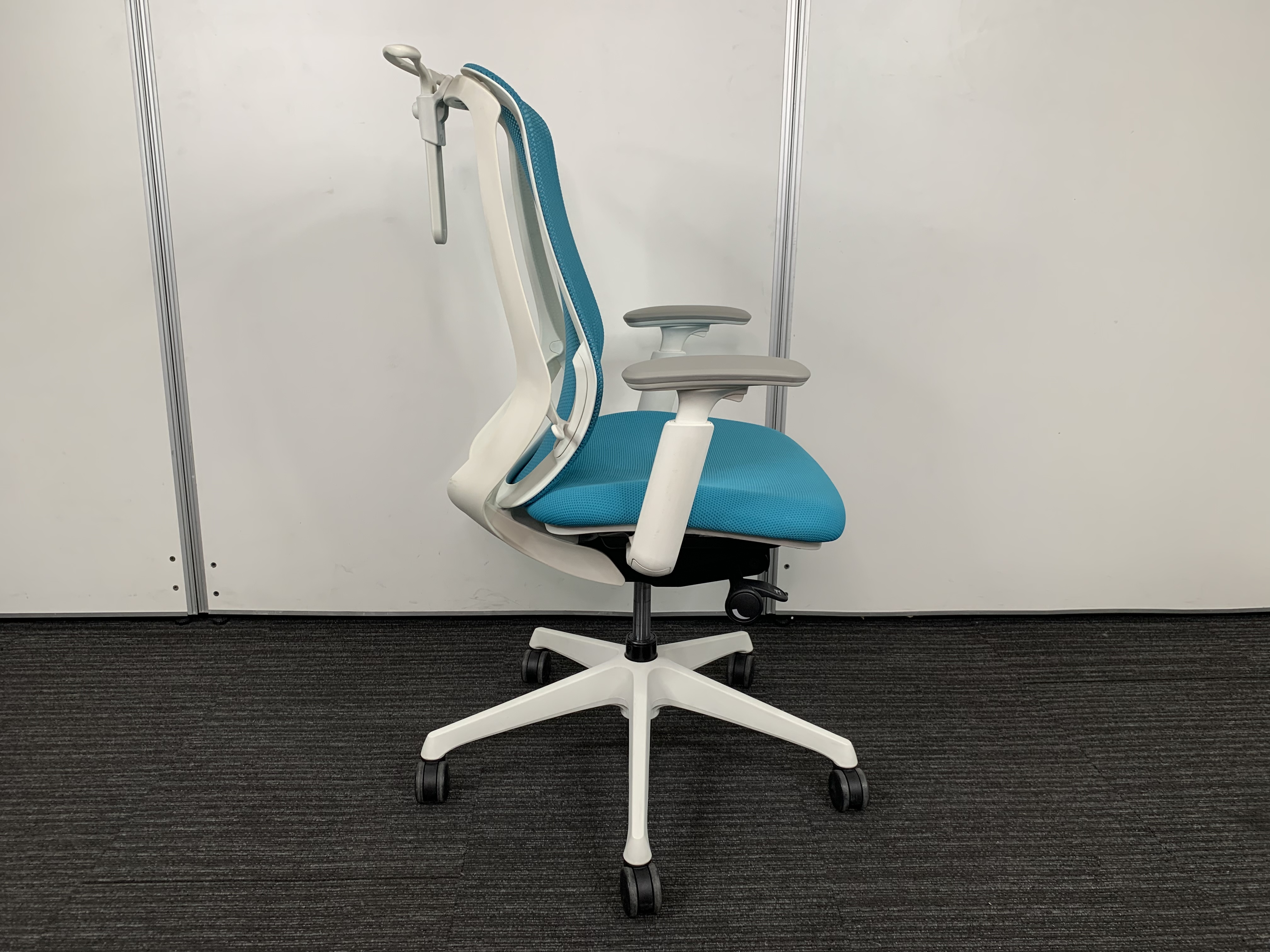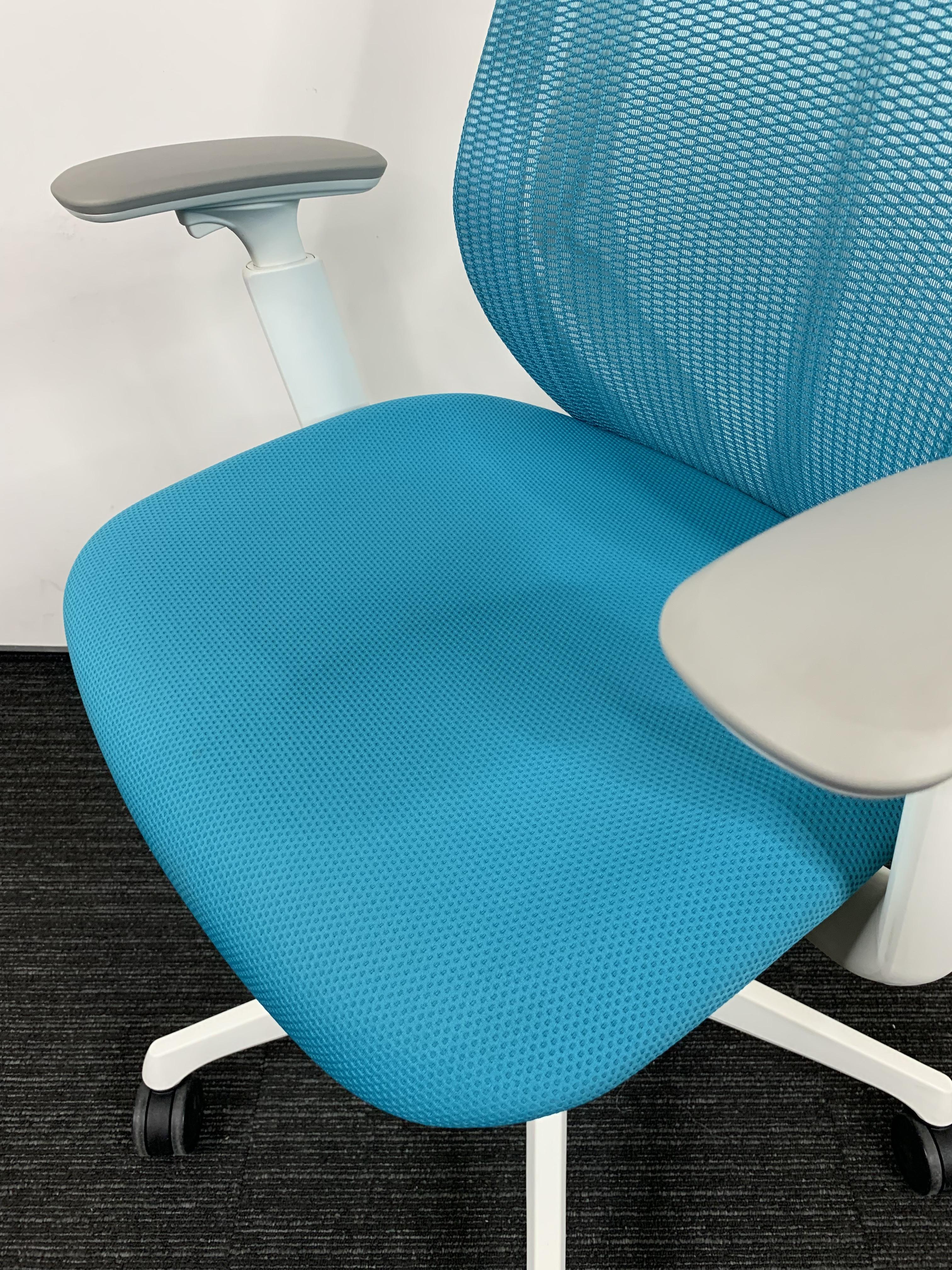 《現物写真だから安心!》オカムラ製の人気オフィスチェア【シルフィーメッシュ/可動肘/ヘッドレスト付き/ブルーグリーン】が先着1名様ご案内可能です!