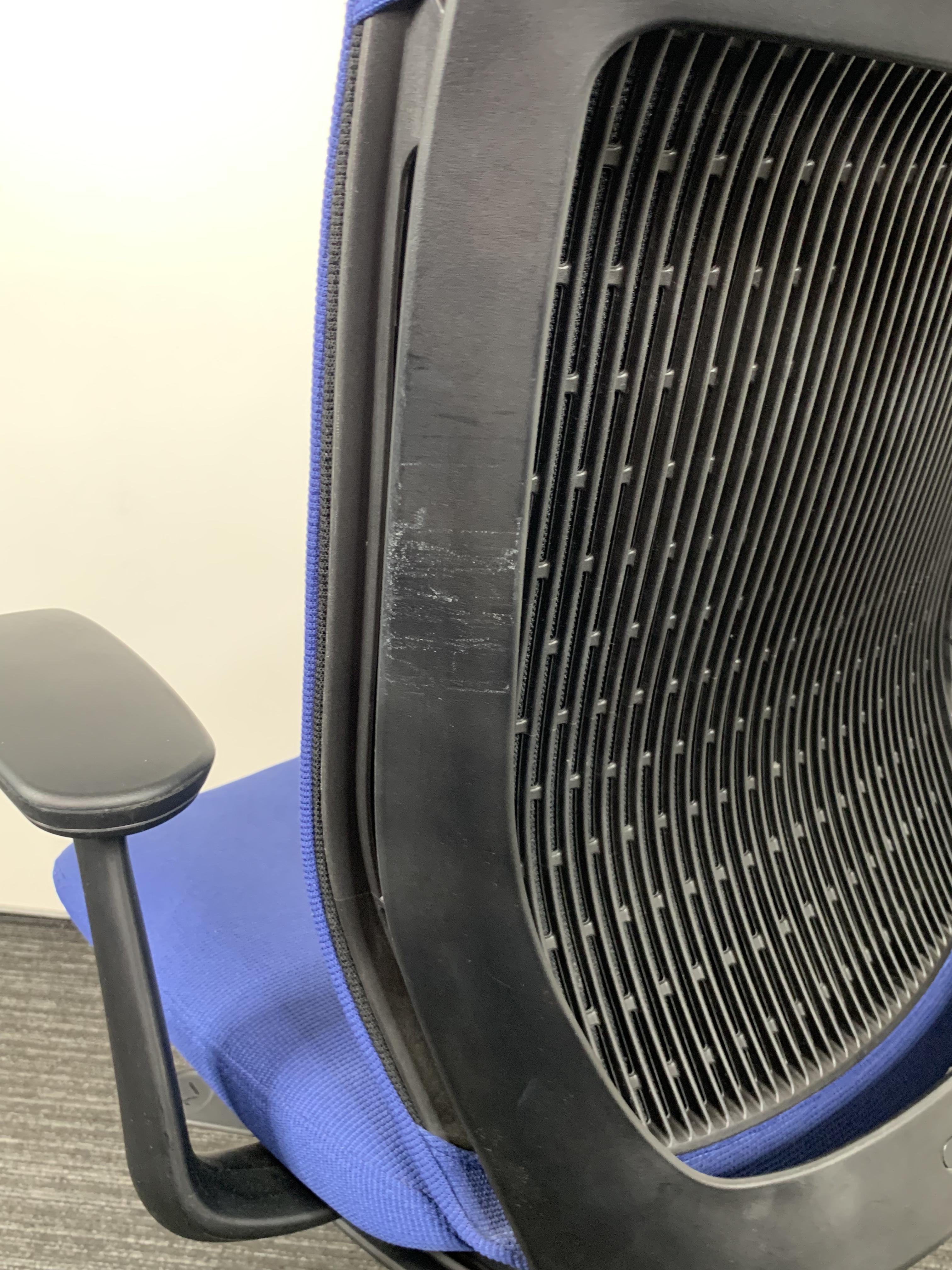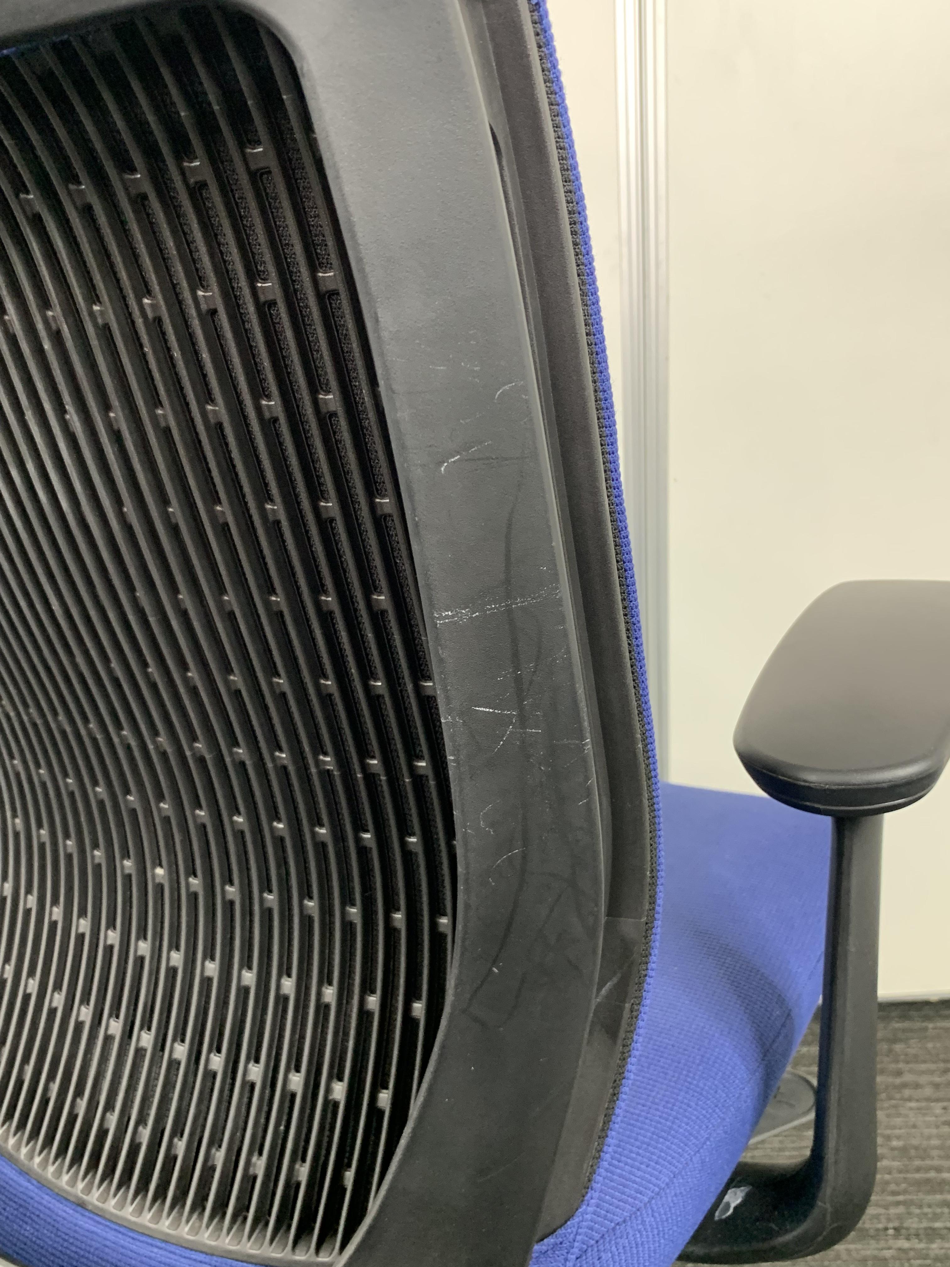 【人間工学に基づいた快適な座り心地!背によりかかるとバックシェルのグリッドが変形し、やさしくワーカーの身体を支えます!】■オカムラ(okamura)製 ヴィスコンテチェア (Visconte) 肘付きローバック ■固定肘 ■ミディアムブルー×ブラックシェル