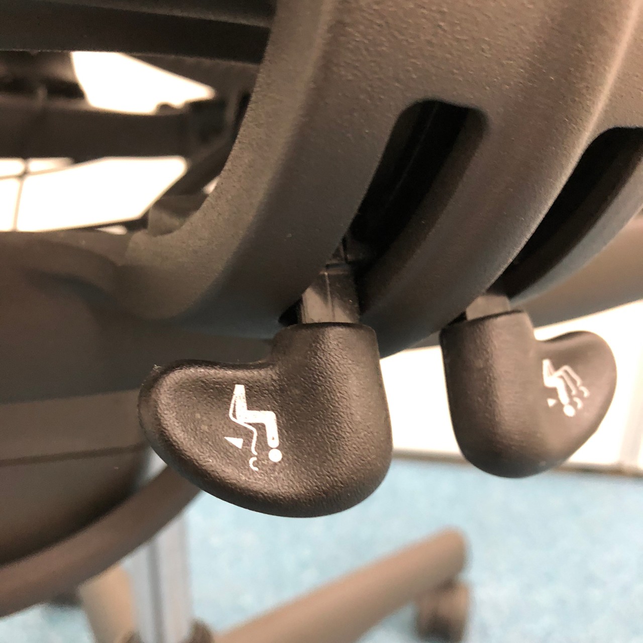 - 背もたれの裏にあるランバーサポート(パッド) の厚さは裏表で調節。上下の移動で、適切な高さ に調節できます。