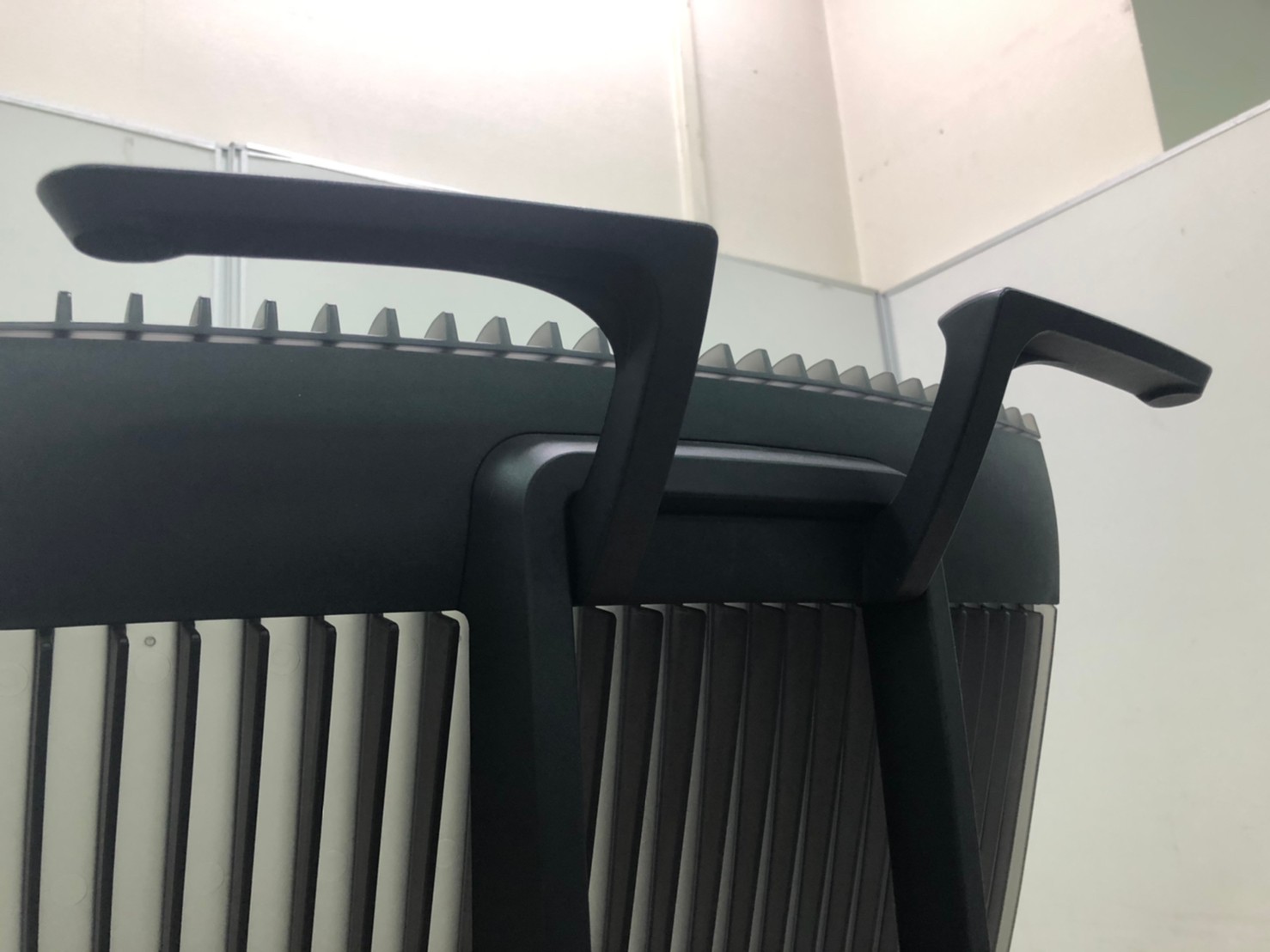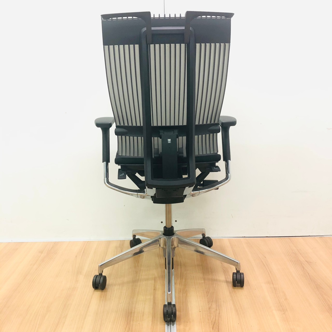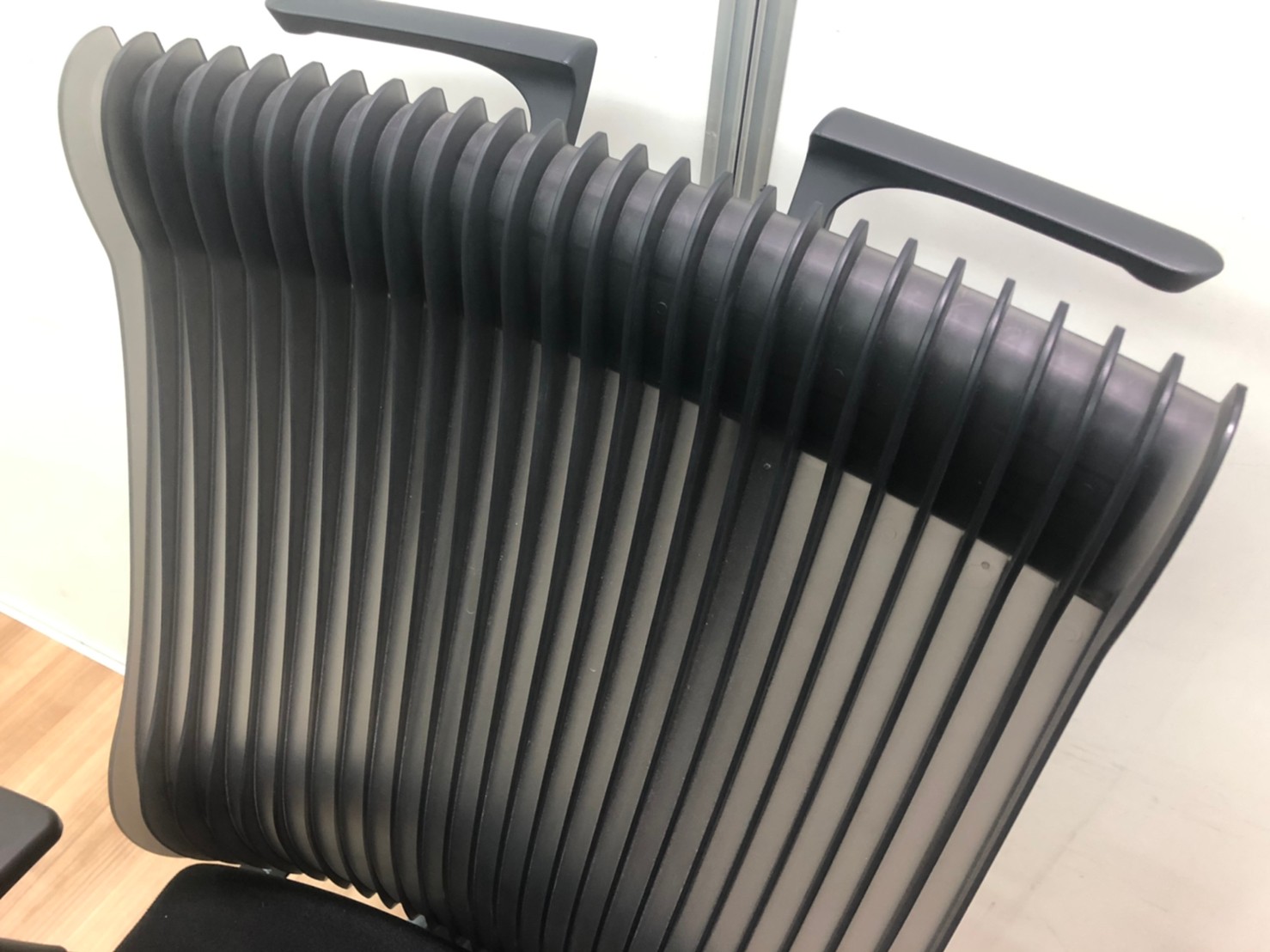 見た目は少し硬そうに見えるエラストマー素材ですが、座ってみると程よいしなり具合のやわらかな座り心地で、背中が痛くなるようなことはまるでありません。面ではなく線で支えることで、背面の通気性の良さは抜群です。