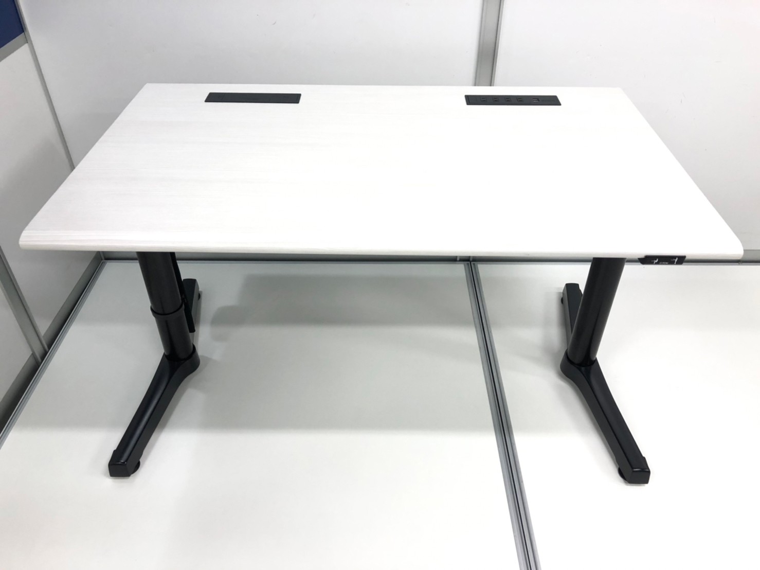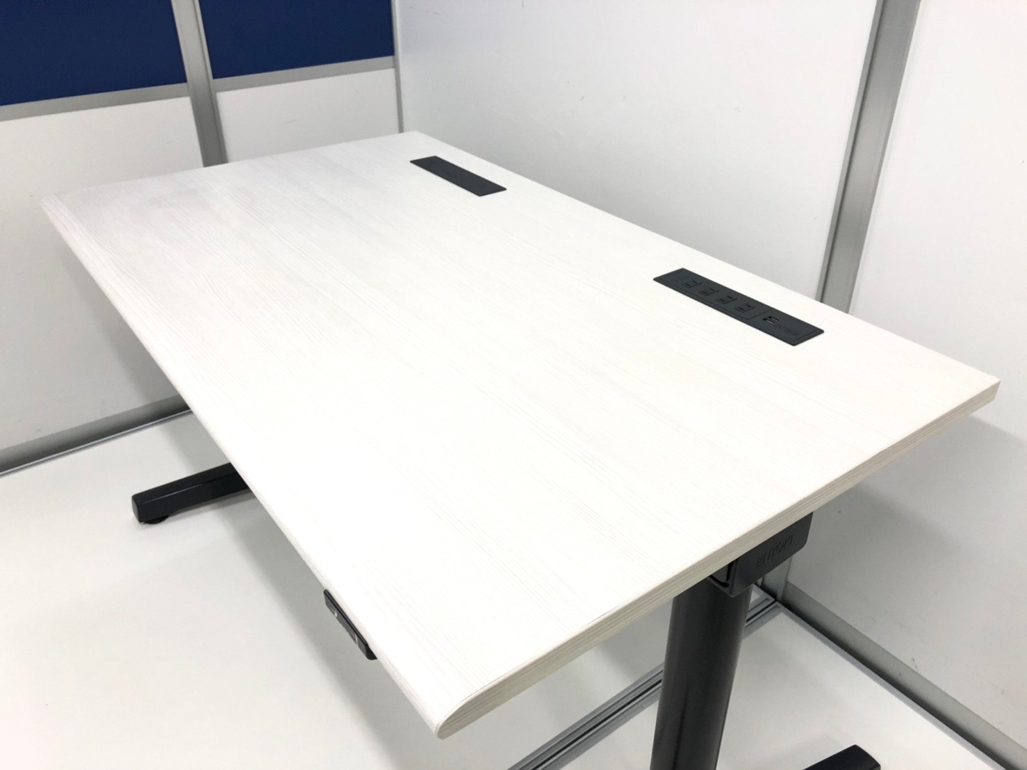 オフィスによく合うホワイトベースの木目調で脚は流行りのブラック色でオススメの一品です。