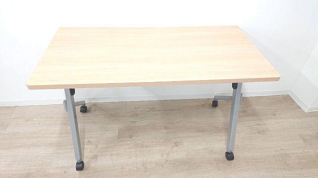 【天板跳ね上げ式でコンパクトに!キャスター付きで移動も楽々!】■オカムラ(okamura)製 フラプター(FLAPTOR)シリーズ サイドスタックテーブル 木目ナチュラル 幕板付き 《オフィスバスターズ福岡博多店は、福岡を拠点として、日本全国へ中古オフィス用品・オフィス家具を提供しております》