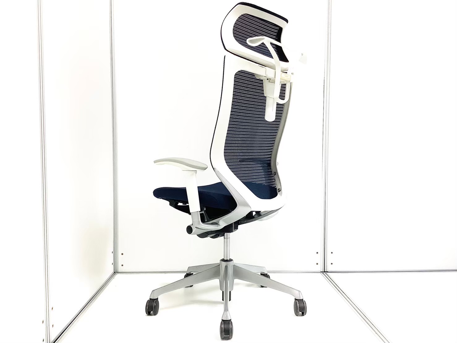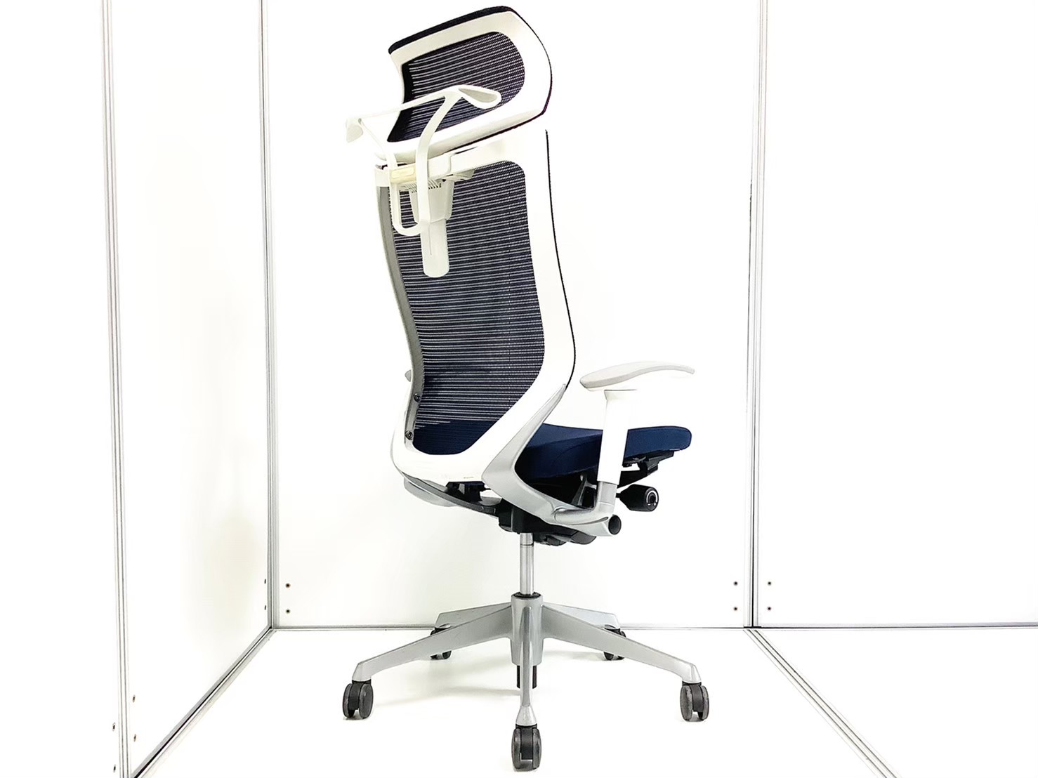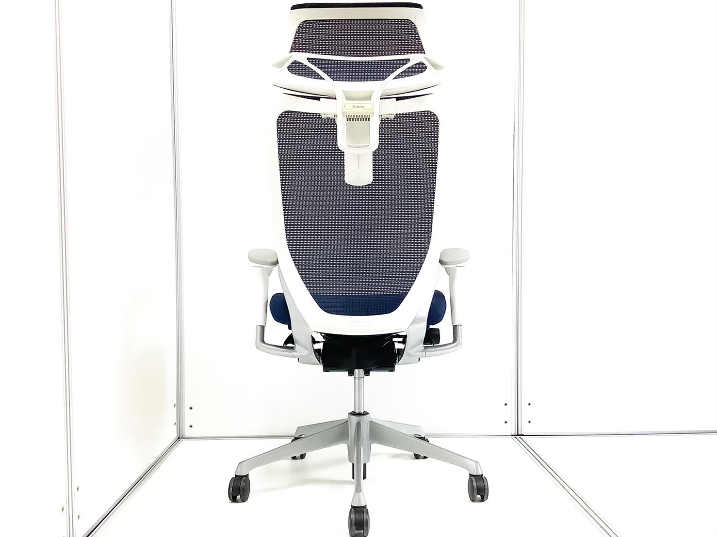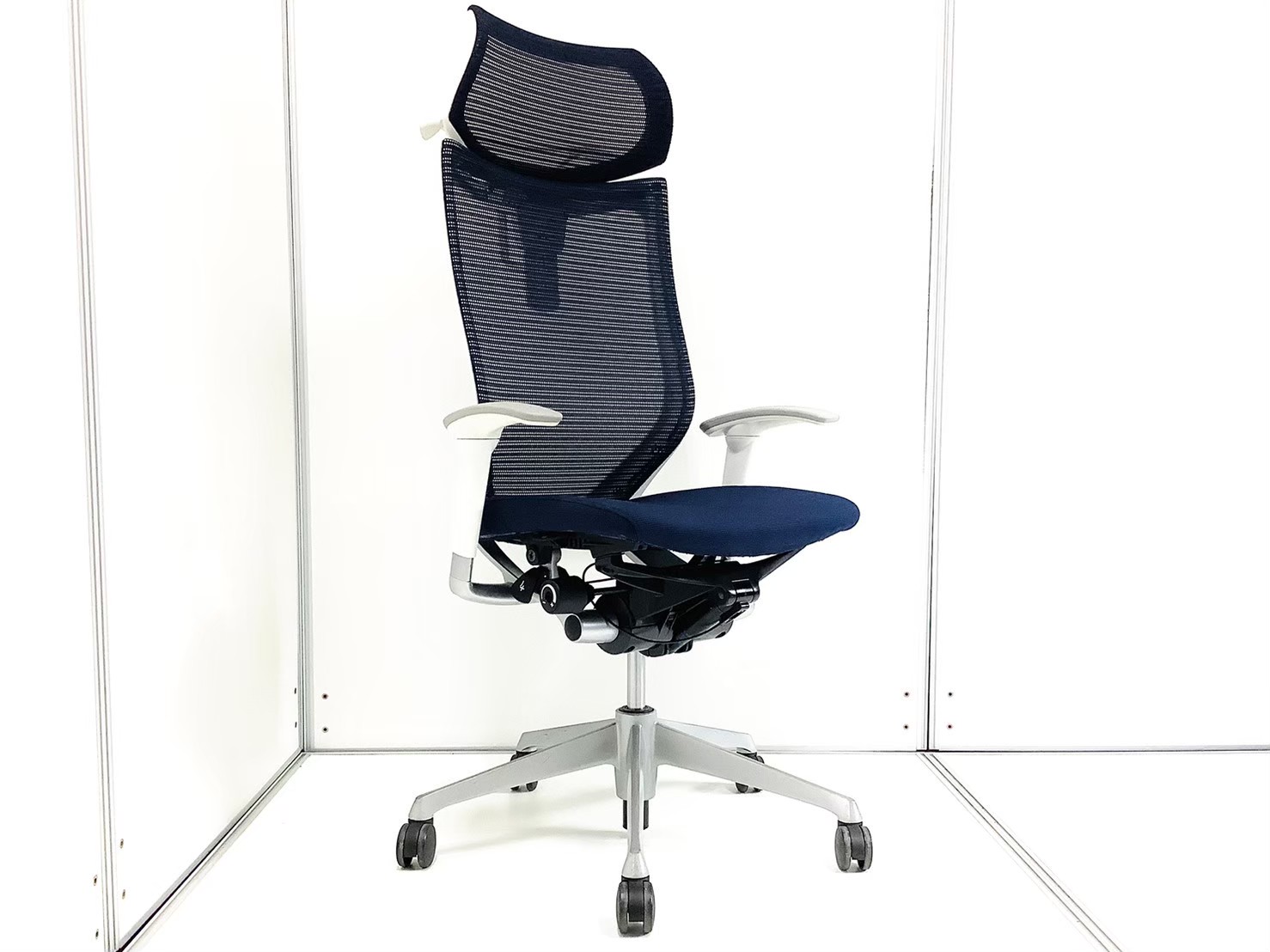 【2脚入荷】【オフィスの執務室、会議室におすすめ!】■オカムラ(okamura)製 バロン(Baron)チェア 肘付き ハイバック 背面メッシュ ■可動肘 ■ダークブルー × ホワイトシェル【硬めの座面が大人気!国産メッシュチェアの代表格!】