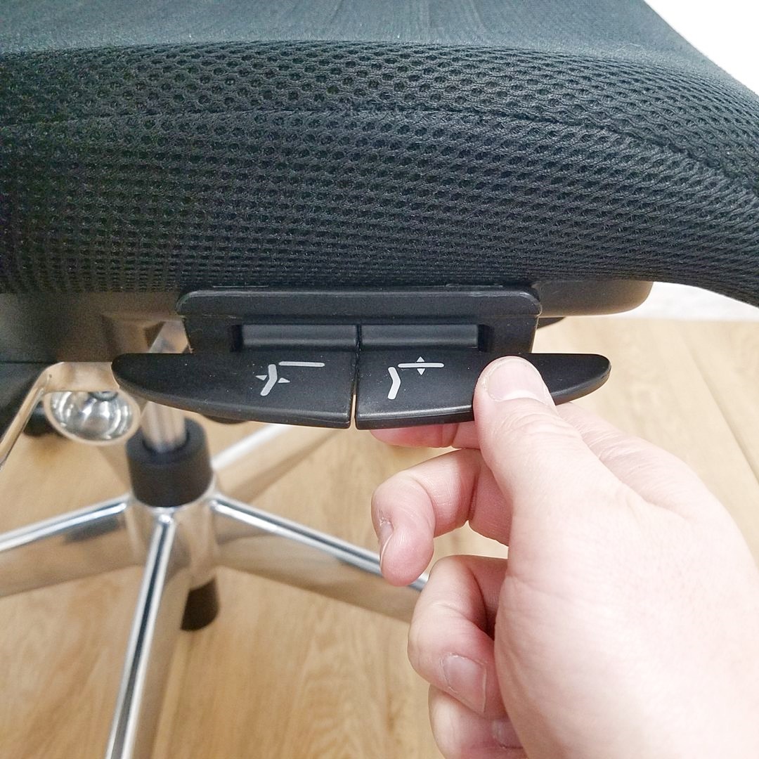 - 座る人の体格に合わせて、シート奥行きは前後54mm、高さ100mmの調整が可能です。また、調整レバーを座面シートの側面に設けることで、座ったままの姿勢で操作することができます。