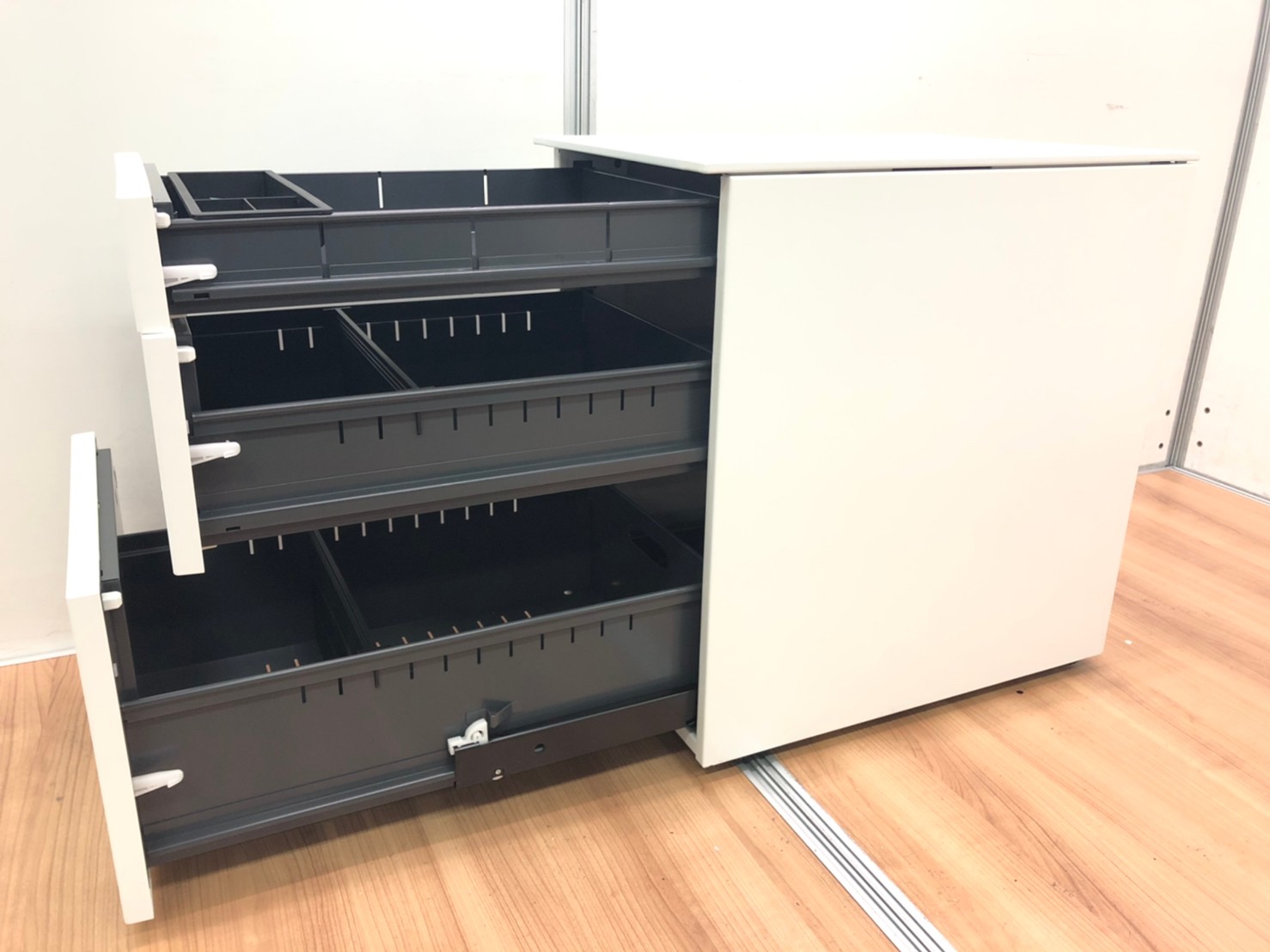 - 多数不具合ありその脇机・ワゴンの本来の効用を果たすための機能以外の多数が使用不可な状態。(例、引出が開閉しづらい、 キャスターロック機能使用不可、ラッチ不良 等がある。)