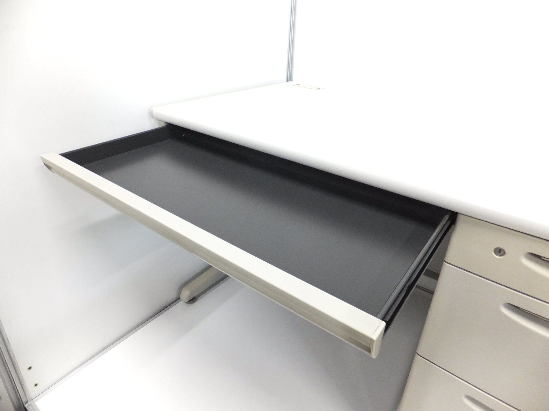 - 袖机のワゴンは、最下段がロング引出しになっており、従来より収納力120%アップ。