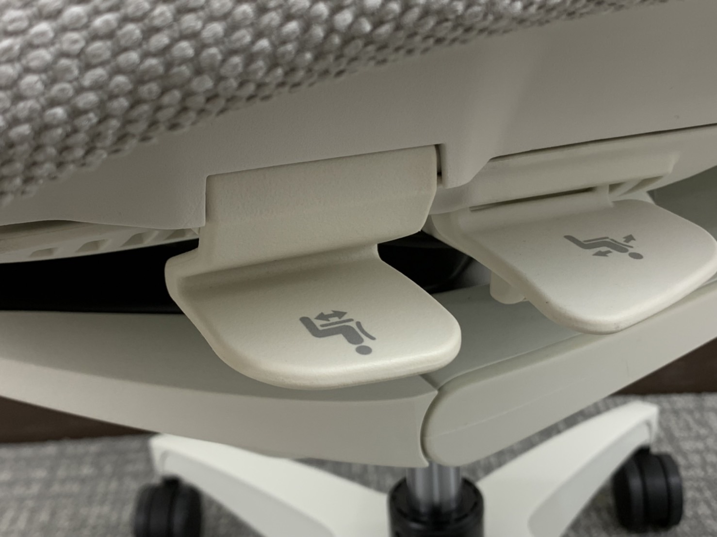 座面左下にあるレバーで、座面を前後(ストローク50㎜)にスライドできます。