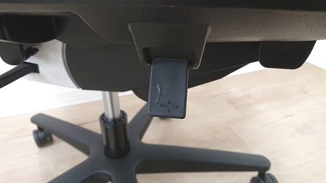 (ファブリック) - レバーを上下させることで、内蔵されたランバーサポートプレートの押し出し量を2段階(15㎜)切り替えることができます。