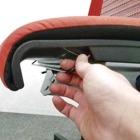 - レバーを引き上げながら座面を前後にスライドさせ、レバーを放すとロックします。背もたれに身体をつけた状態で膝の裏側と座面のエッジの間に5-8センチほどの隙間ができるのが理想的です。