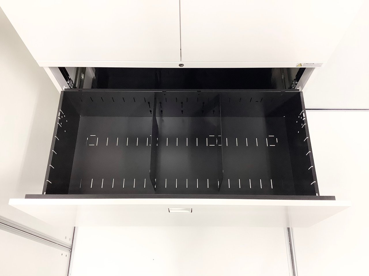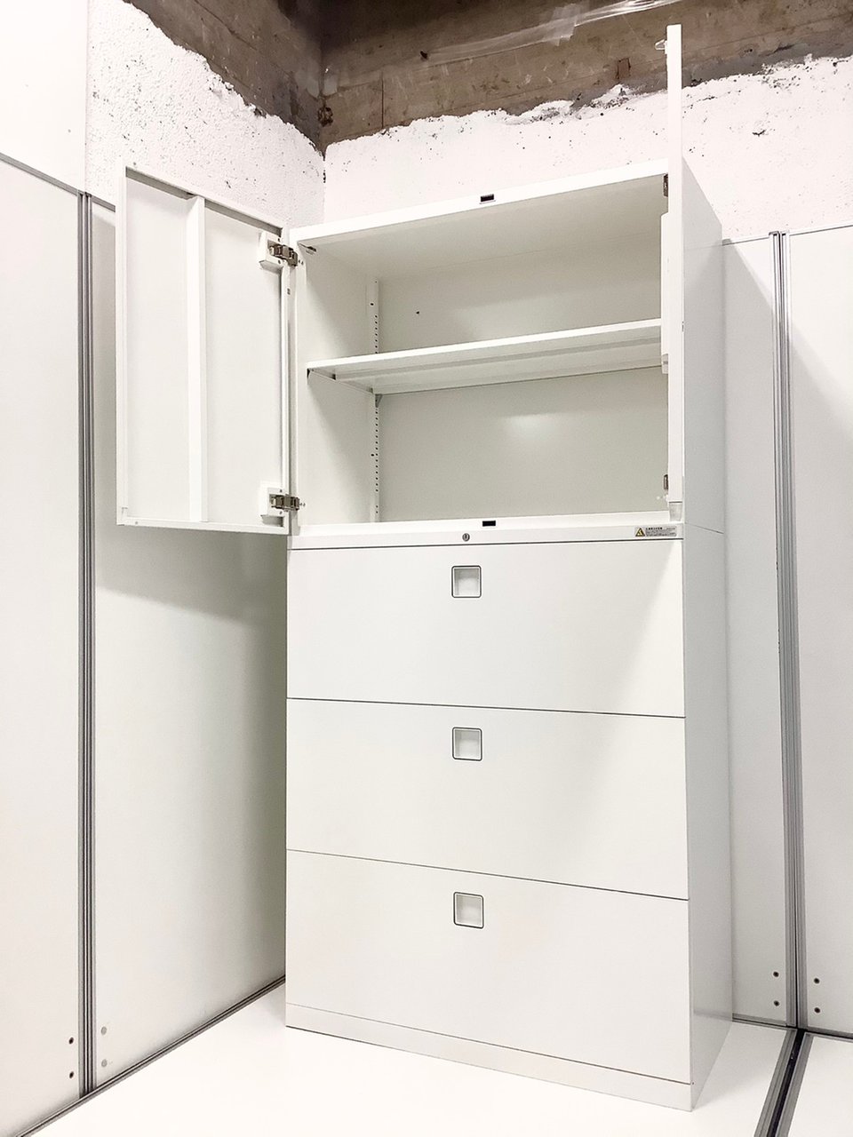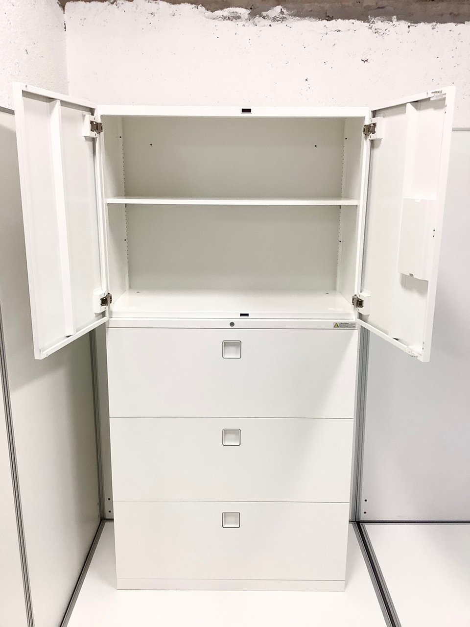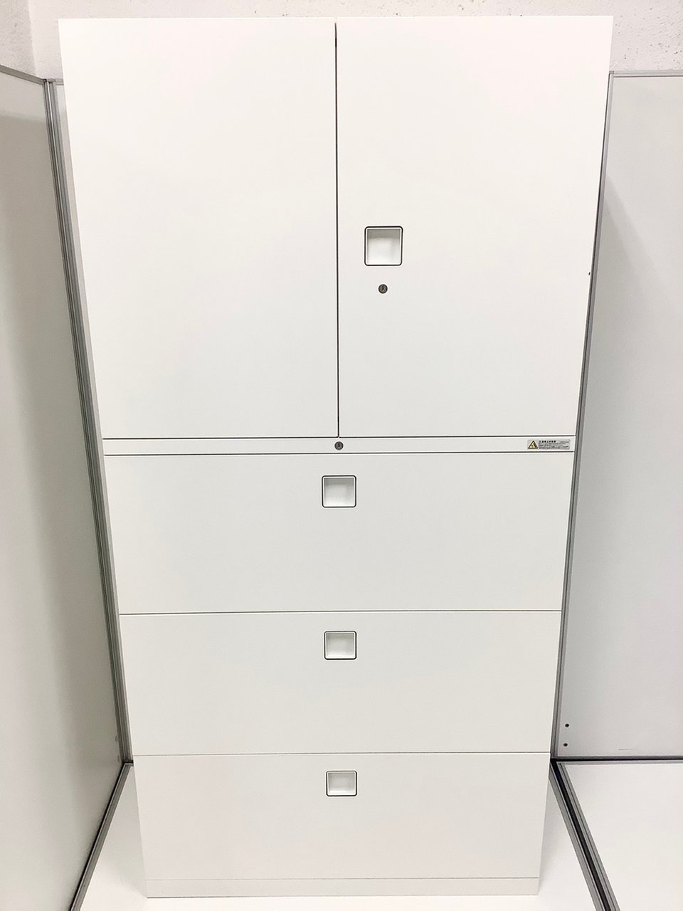 スライド式の扉+引き出しタイプの便利な書庫セットが入荷!使い勝手抜群のハイキャビネットが入荷! ■オカムラ/レクトライン/ホワイト 2枚引き戸+3段ラテラルキャビネット