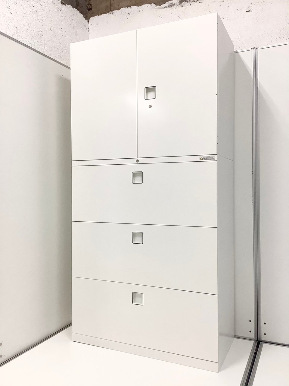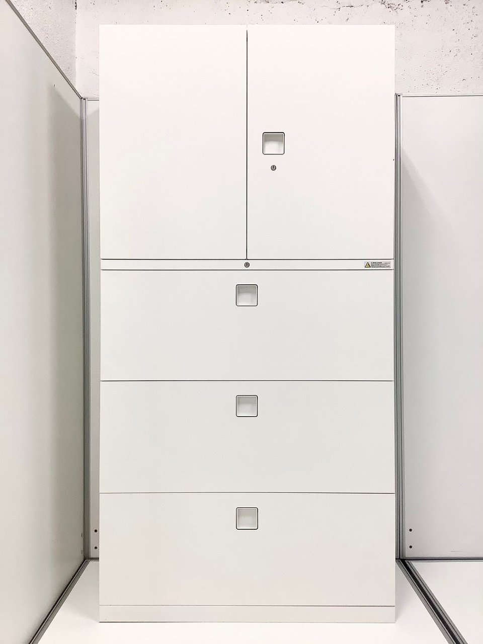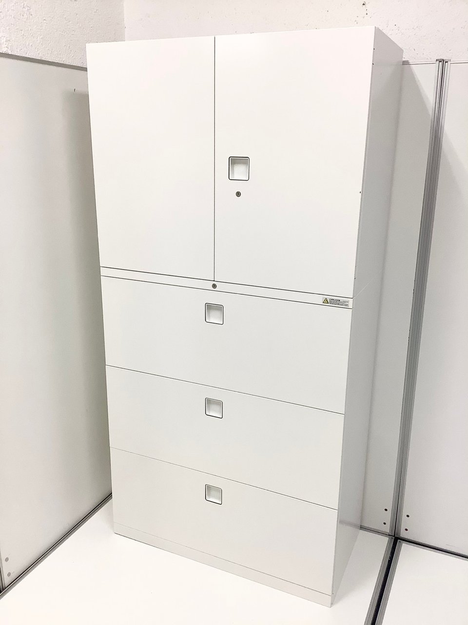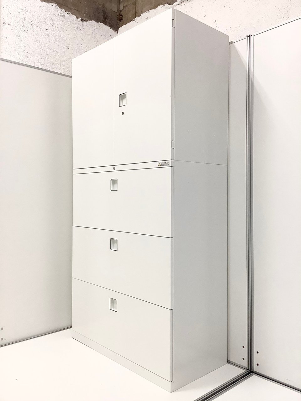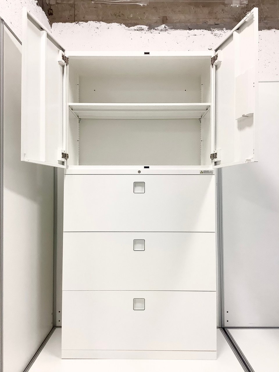 スライド式の扉+引き出しタイプの便利な書庫セットが入荷!使い勝手抜群のハイキャビネットが入荷! ■オカムラ/レクトライン/ホワイト 2枚引き戸+3段ラテラルキャビネット
