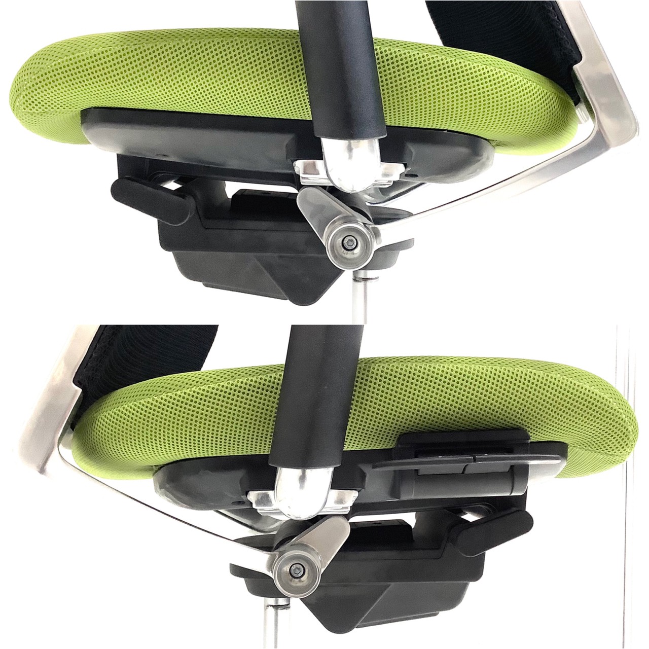 - 座る人の体格に合わせて、シート奥行きは前後54mm、高さ100mmの調整が可能です。また、調整レバーを座面シートの側面に設けることで、座ったままの姿勢で操作することができます。
