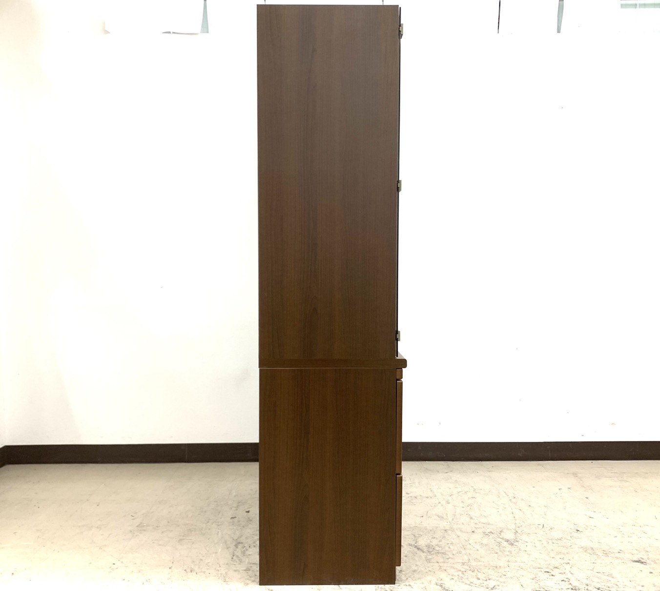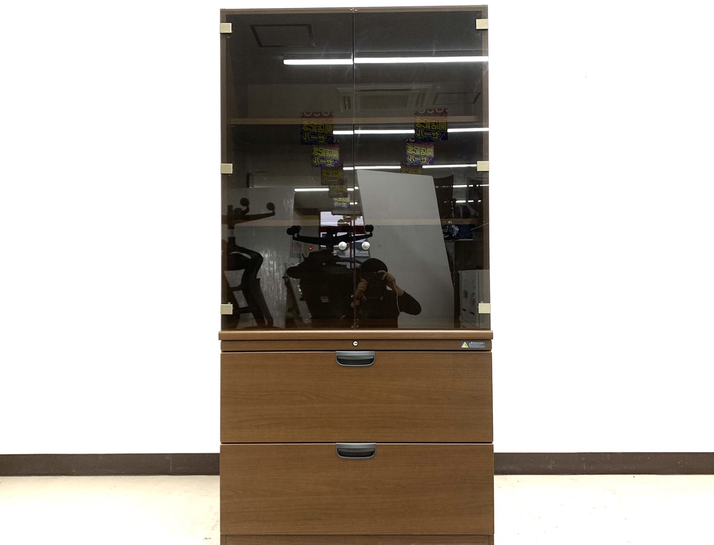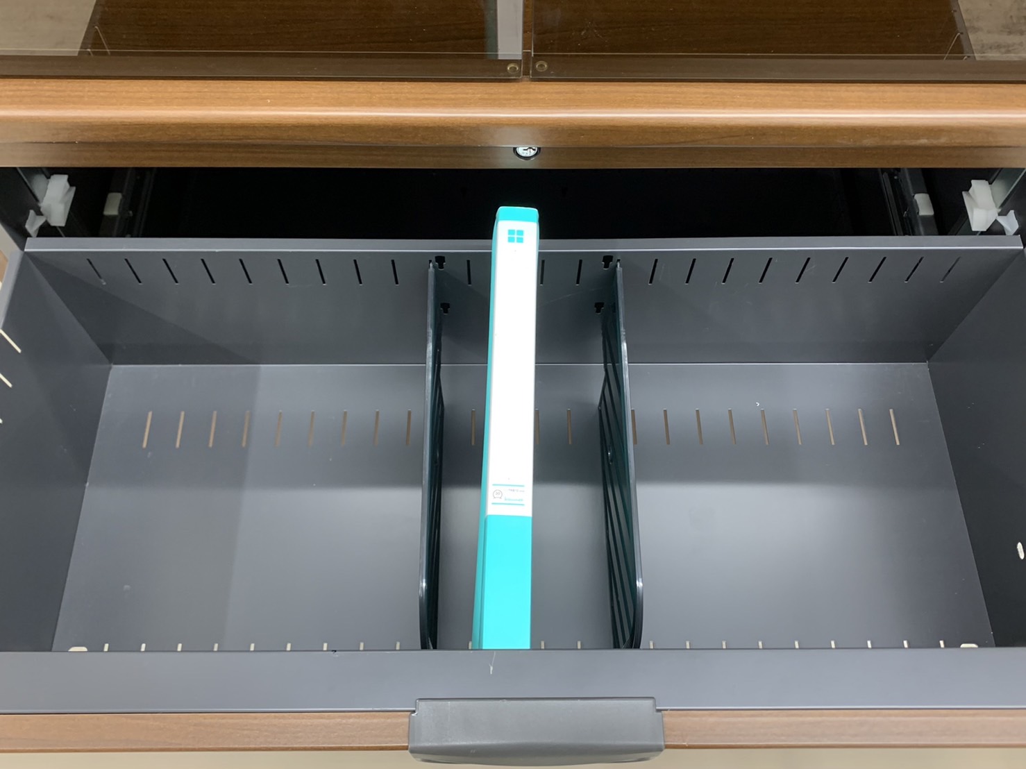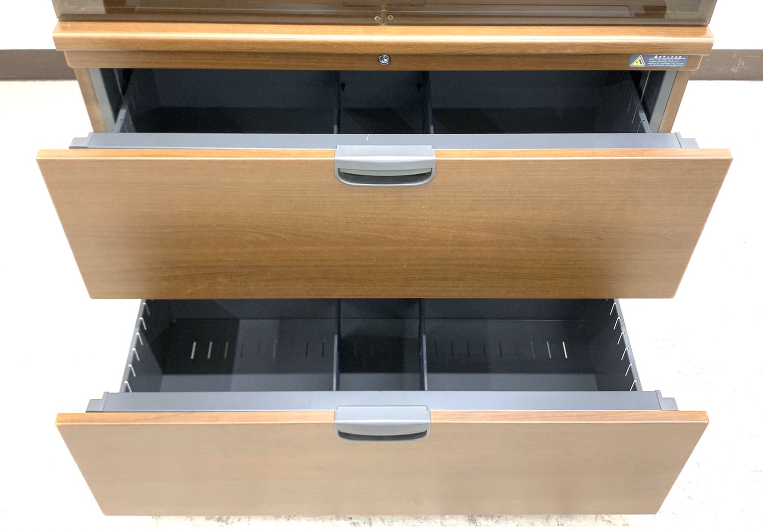 本製品上段のガラス扉は、撮影者の姿が写り込むほどの曇りなき状態となります。下段のラテラル部分は、強度UPのため、内側はスチールの引出となっております。