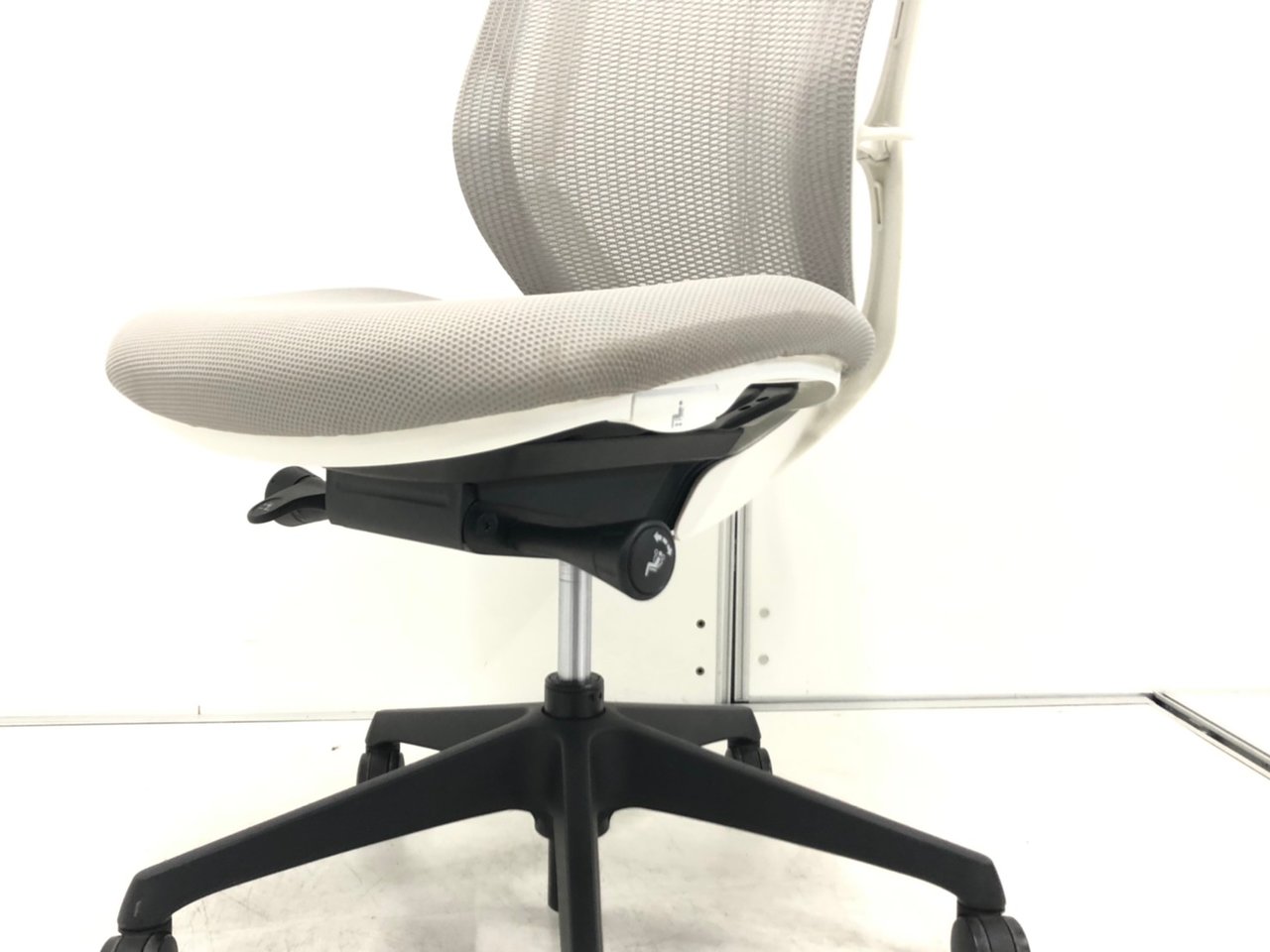 - 座面左下のダイヤルでリクライニングの固定と解除が行えます。 前傾ポジションをとることも可能です。